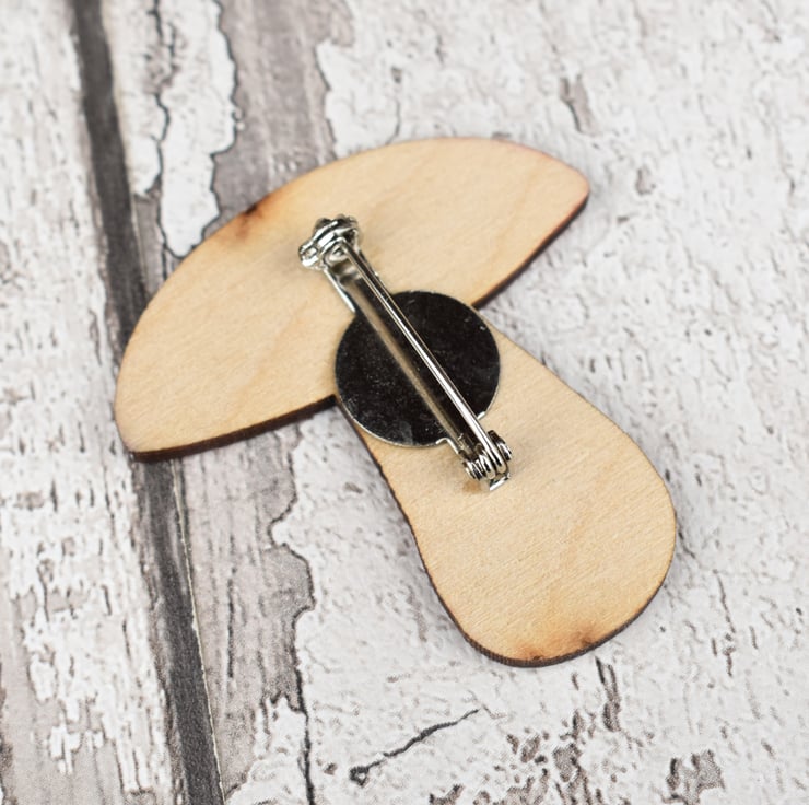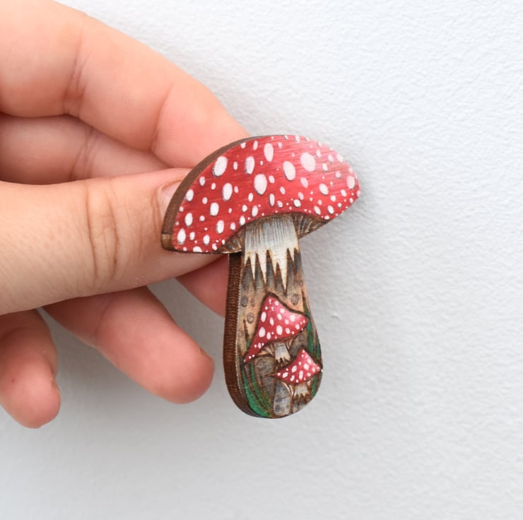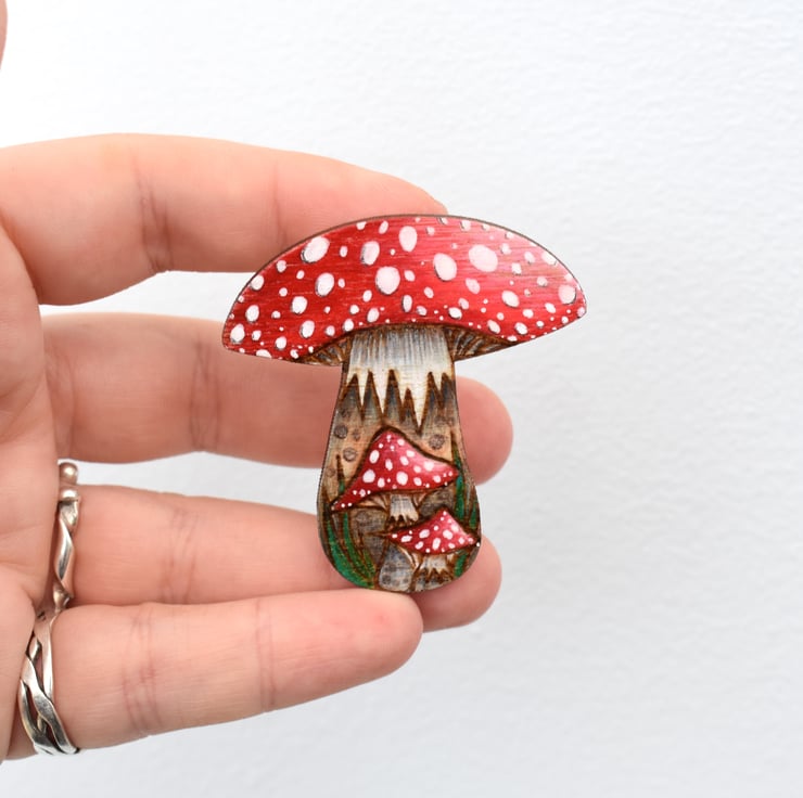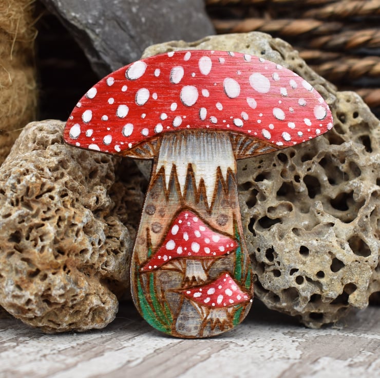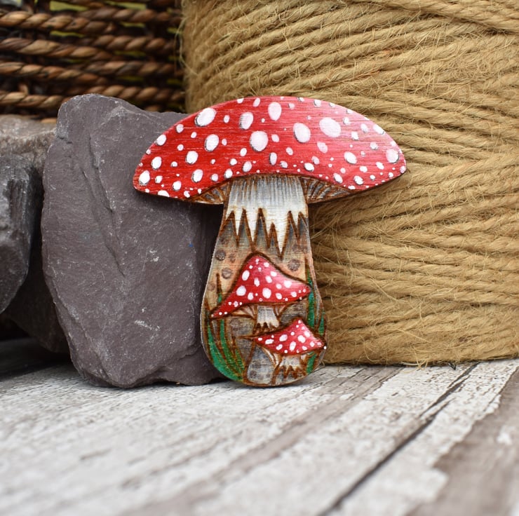 An unusual 'shroom brooch in red and greens, a wonderful toadstool trio on one shroom shape, hand burned using pyrography. This would make a great gift for a fantasy and toadstool lover, or a wood gift idea for a 5 year anniversary.