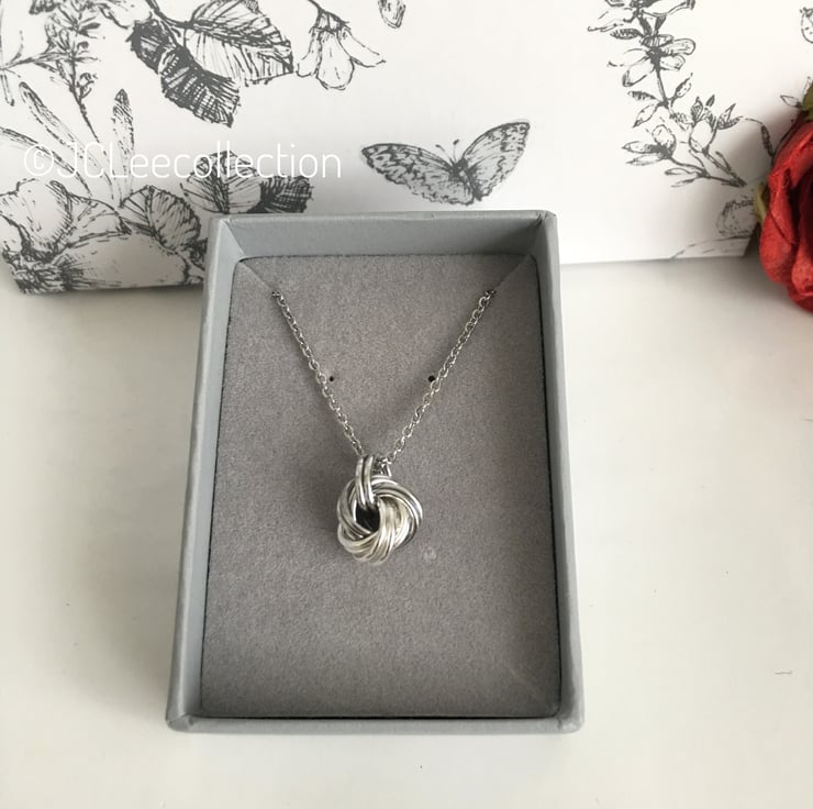 This simple minimalist style necklace is is perfect to wear everyday. The aluminium/silver love knot has been polished and sealed and is attached to an 18" stainless steel chain which will not rust or tarnish.
