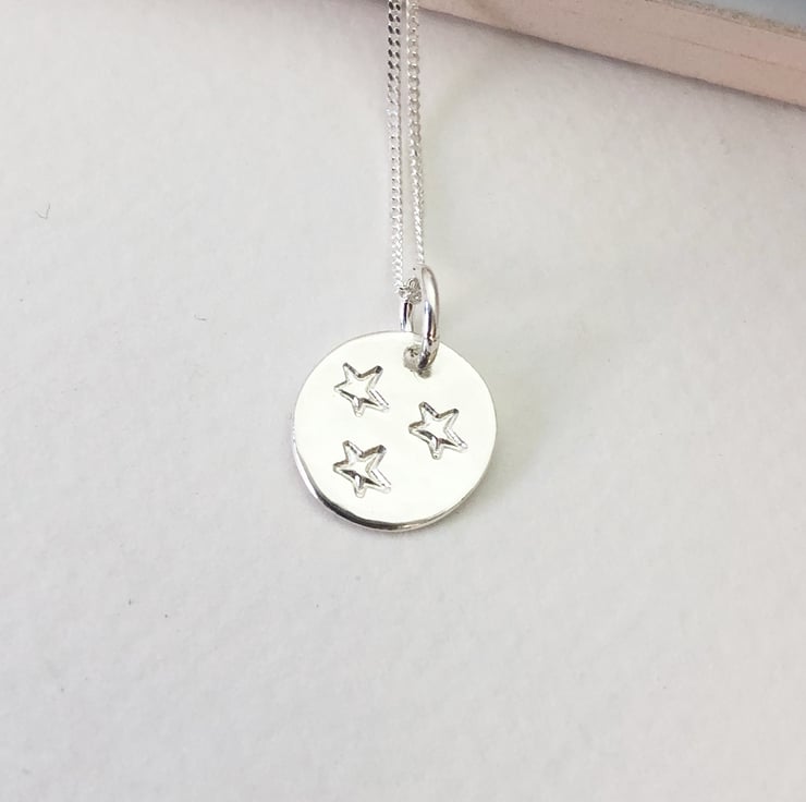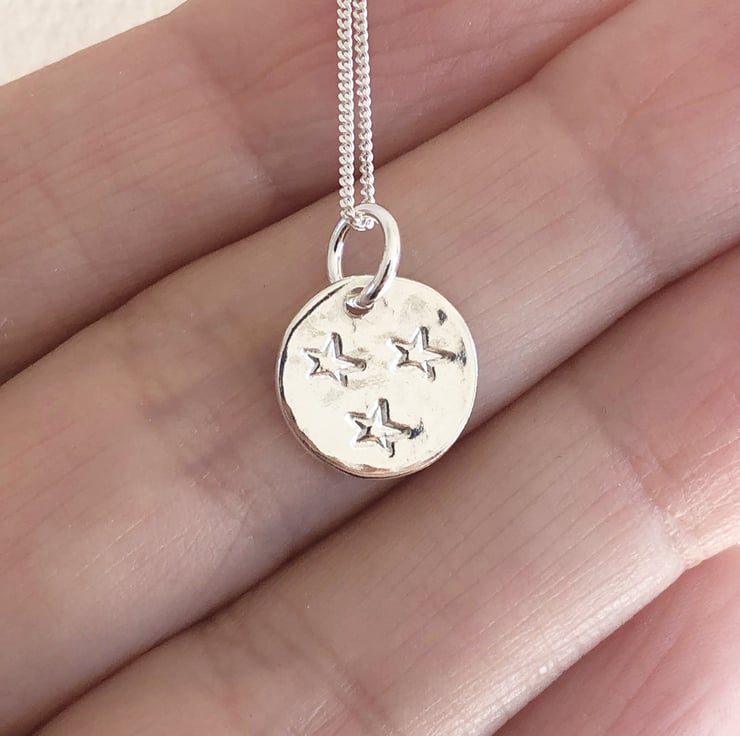 This beautiful Sterling Silver disc features three hand stamped stars.