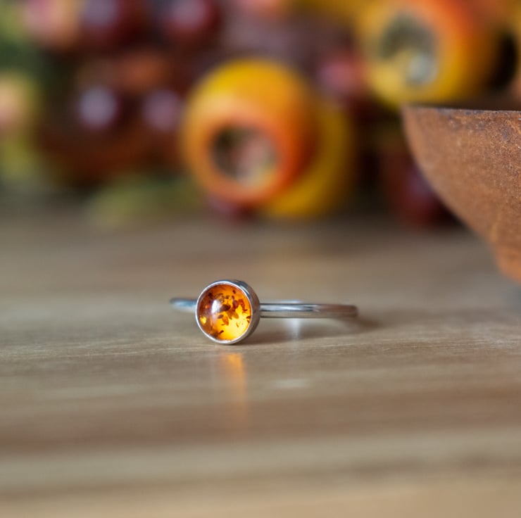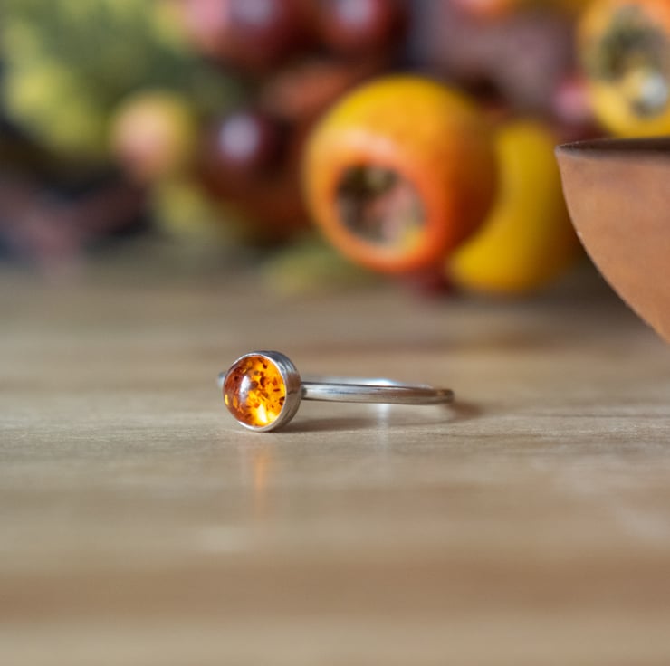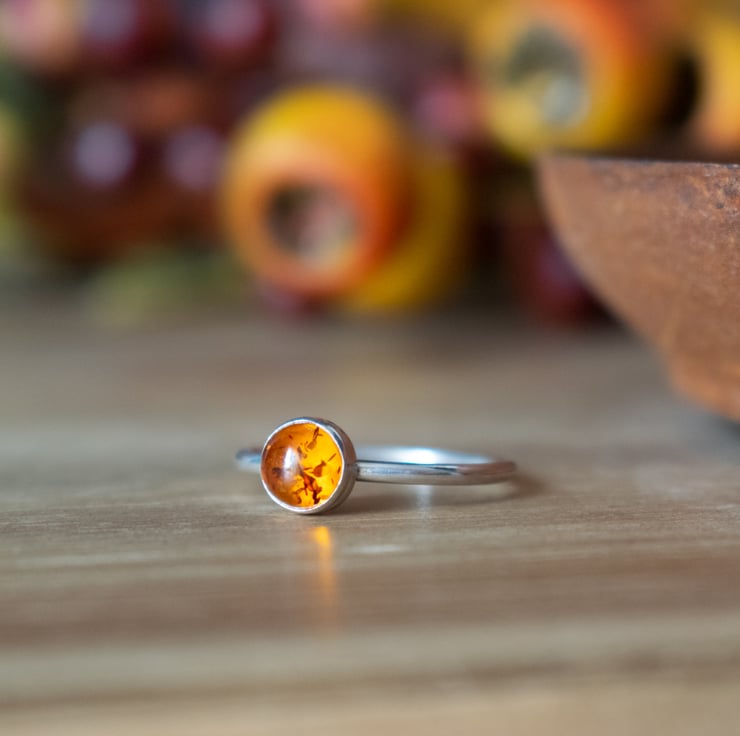 A simple sterling silver ring with real amber cabochon. A beautifully flecked 6mm amber stone with it's own unique markings is set in a bezel surround to give a classic look. Wear alone or use as a stacking ring.