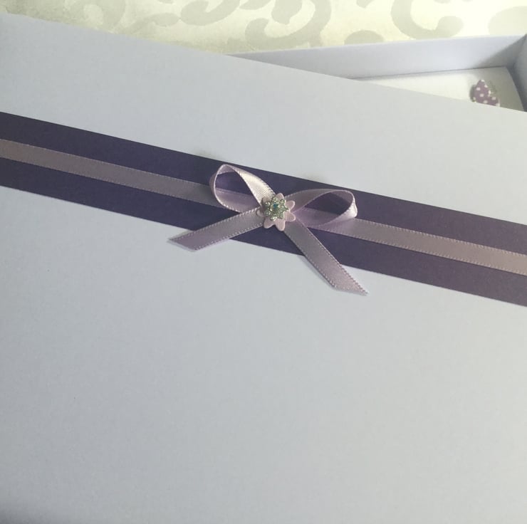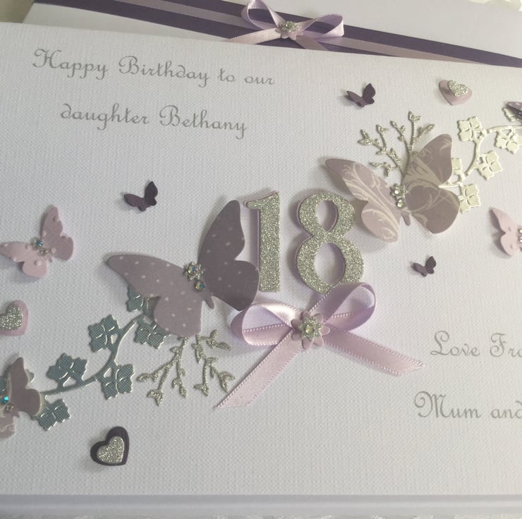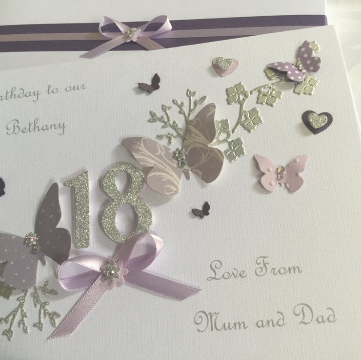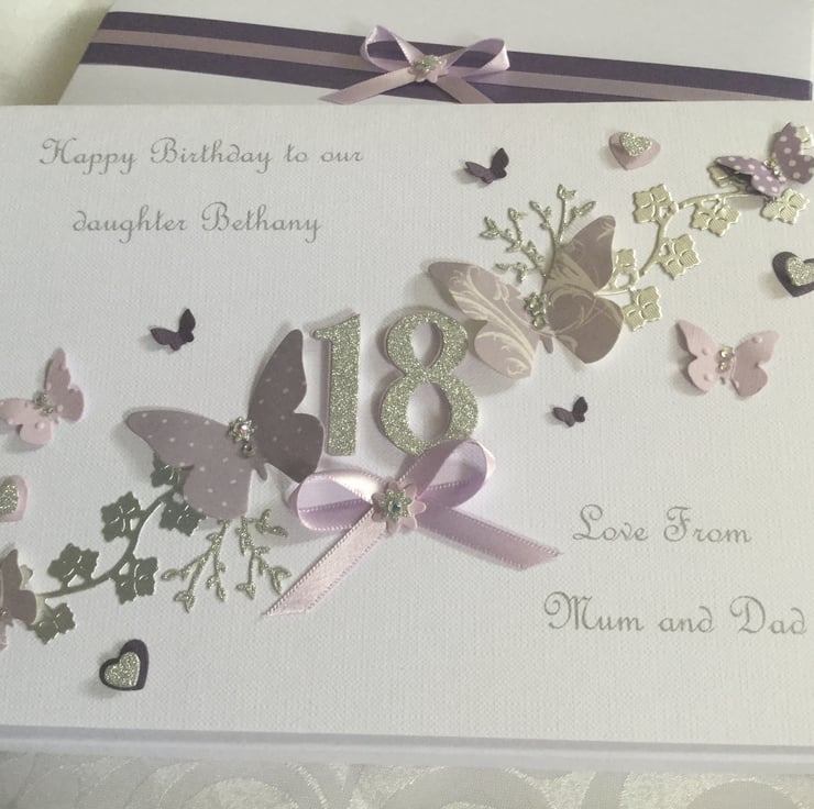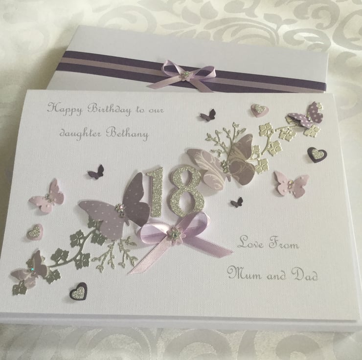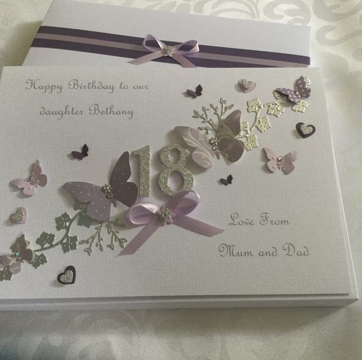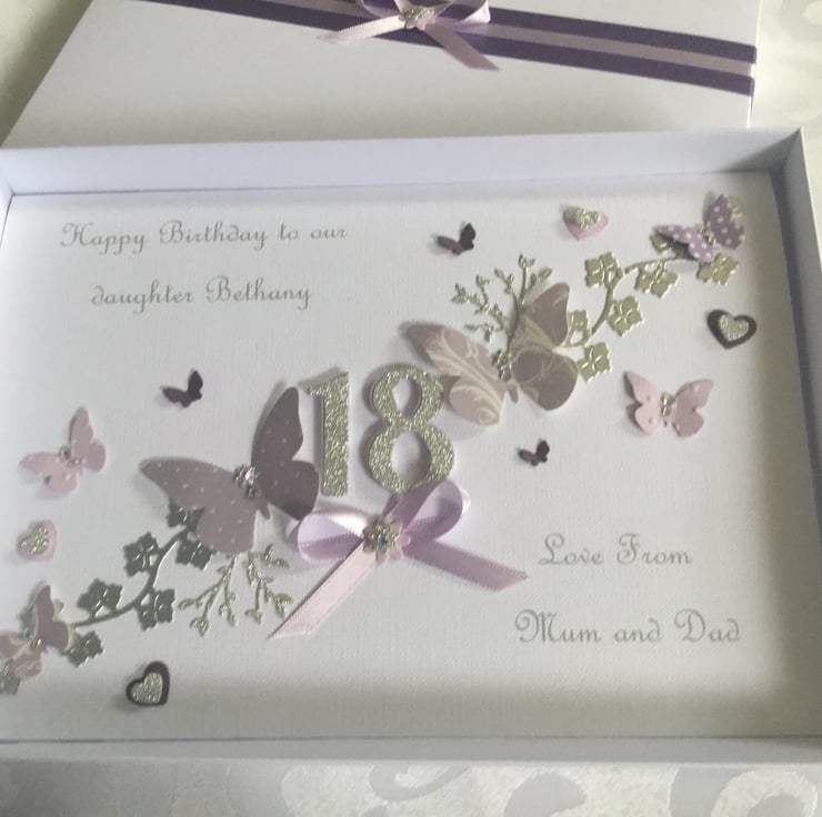 This handmade gift boxed card is A5 in size (210mm x 150mm) and can be personalised for any special birthday. It is on 300gsm cardstock and decorated with ribbons and gems. It comes in the matching decorated box and makes a wonderful keepsake.
