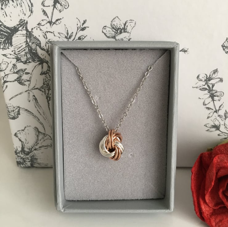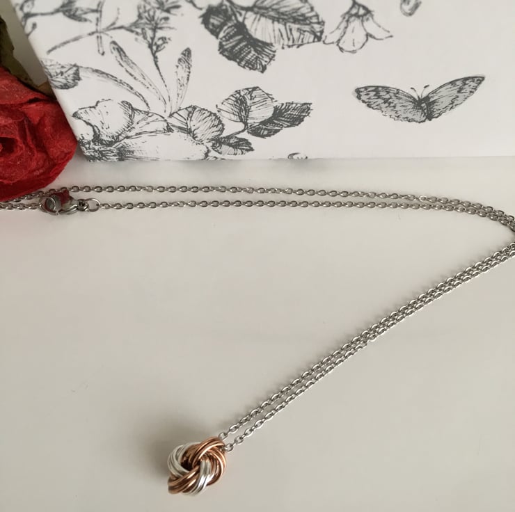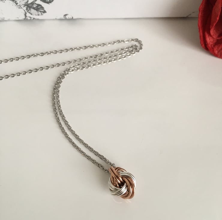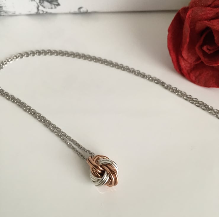 The danish knots are created by linking saw cut chainmail rings in pure bronze and sterling silver, and are suspended from a stainless steel chain of approximately 18" in length. Stainless steel signifies durability and strength, and the necklace can be worn each day as a reminder of your bond together.