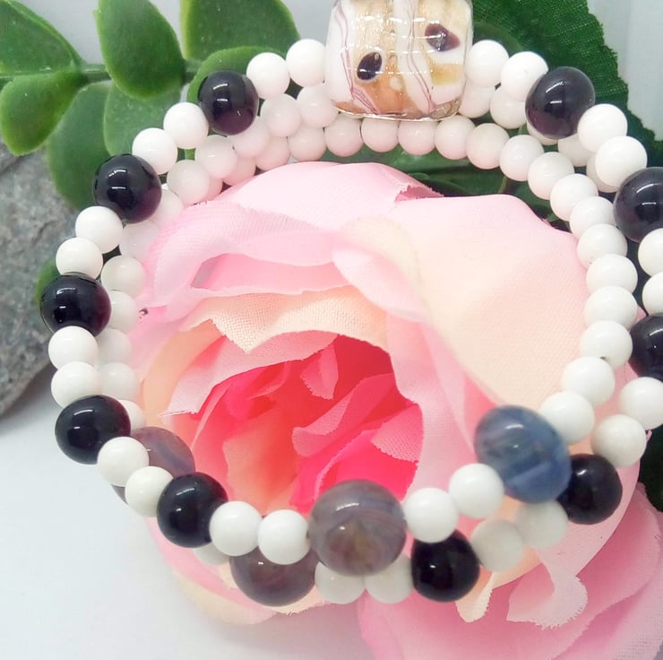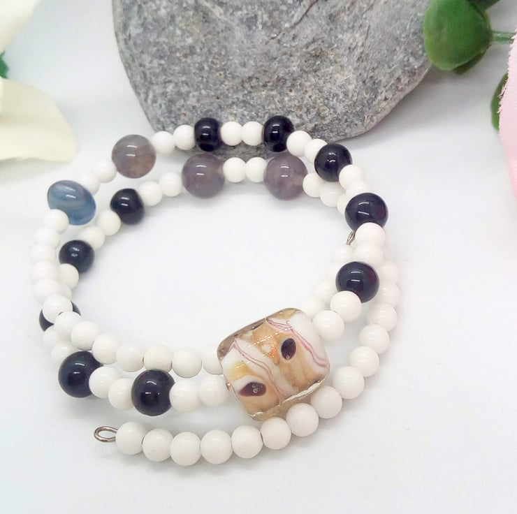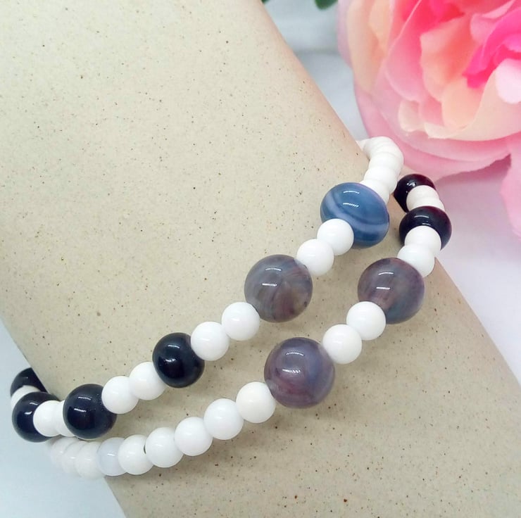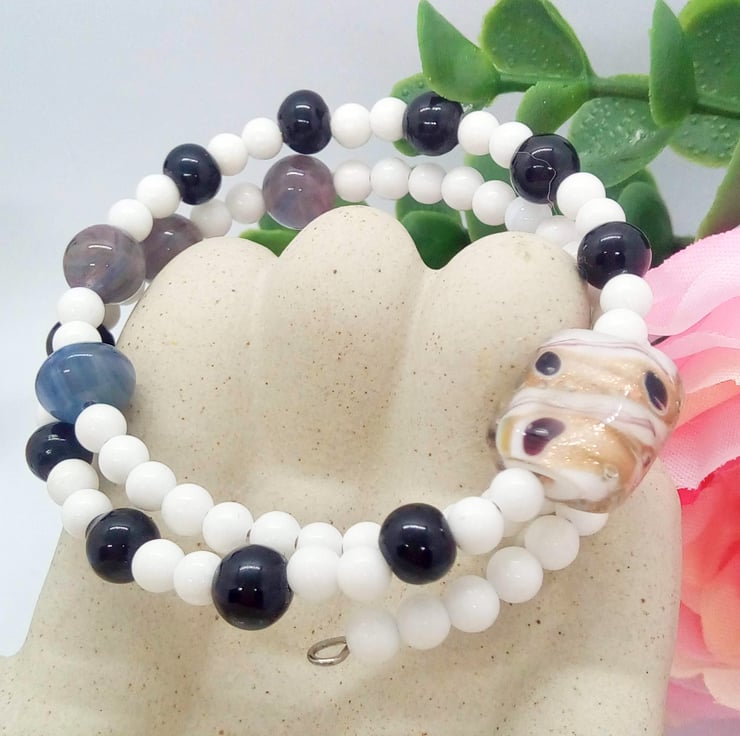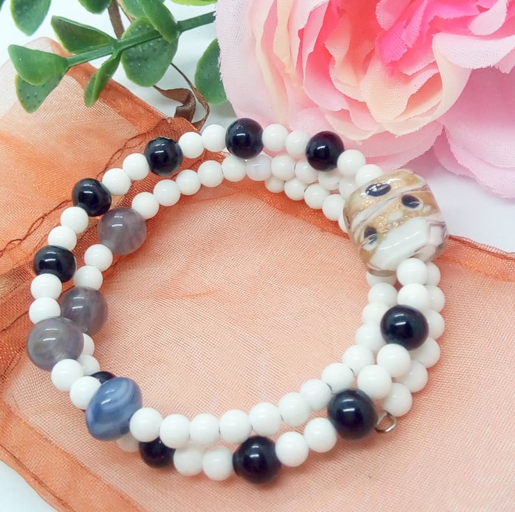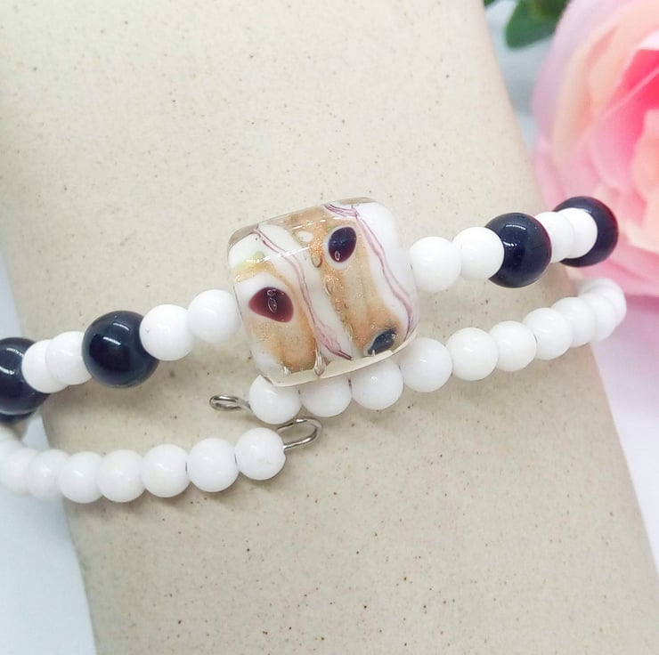 A sweet little black and white glass beaded memory wire cuff bracelet which will complement most outfits for a day or evening out or a party. It would also make a lovely birthday or anniversary gift for a friend or relative, or a lovely treat for yourself.
