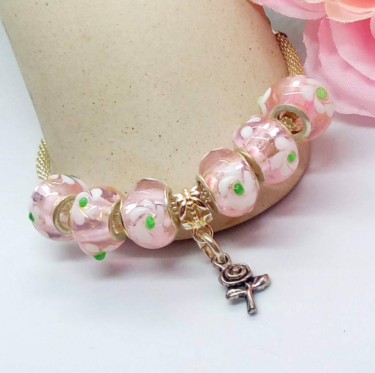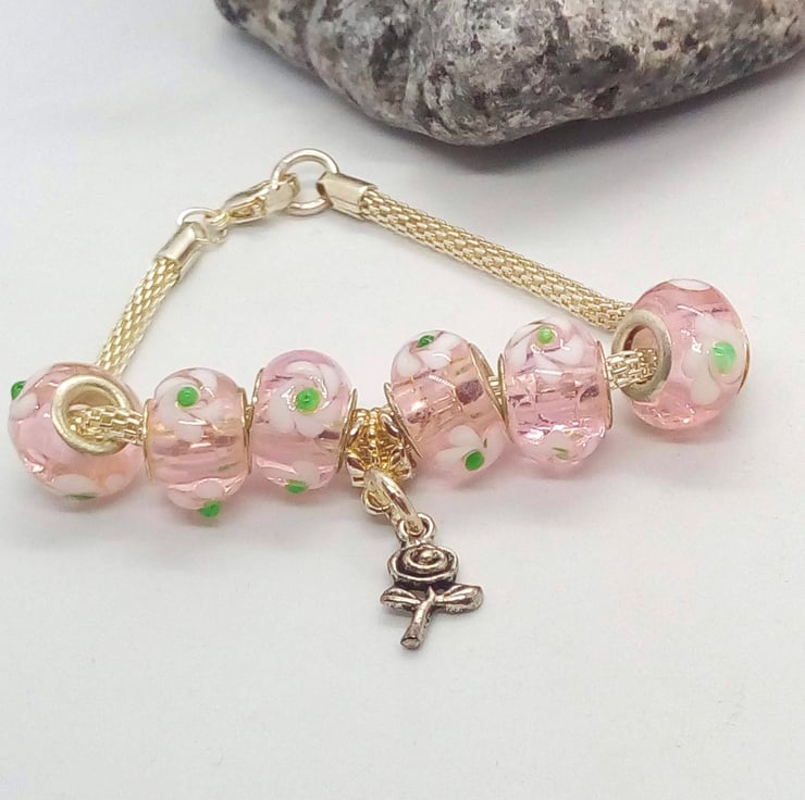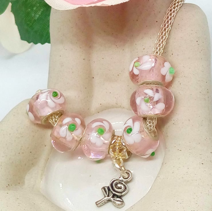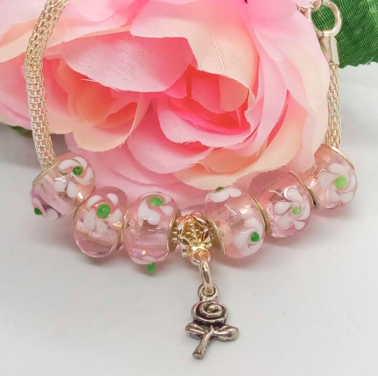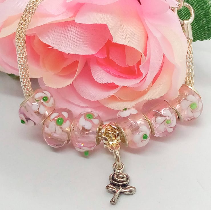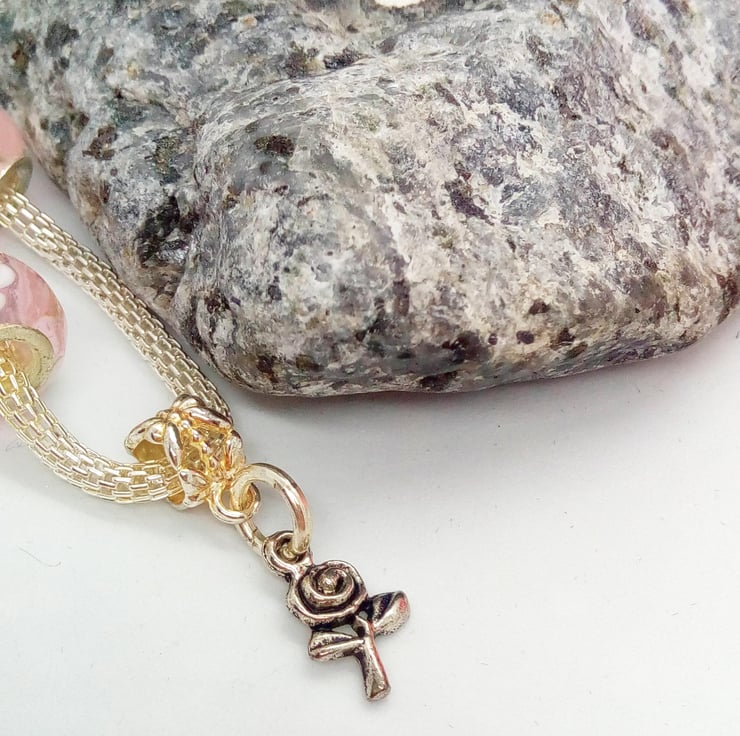 The bracelet is made using pink lampwork beads and a silver plated rose charm on a silver plated mesh chain bracelet. The round beads are 12 x 10mm and the rose charm measures 10 x 10mm. The bracelet is 19 cm (7.5 inches) in circumference and has a silver plated lobster clasp.