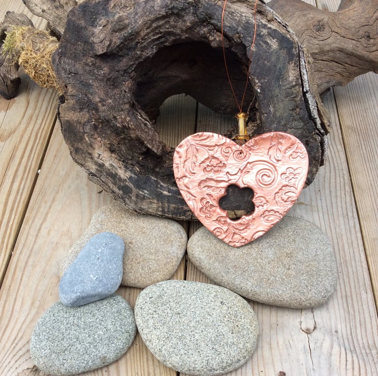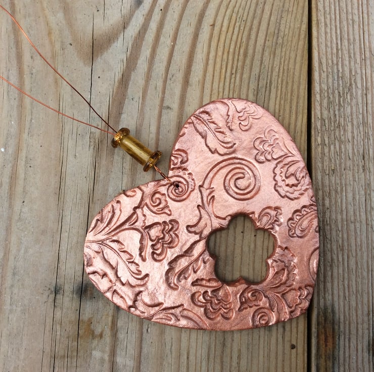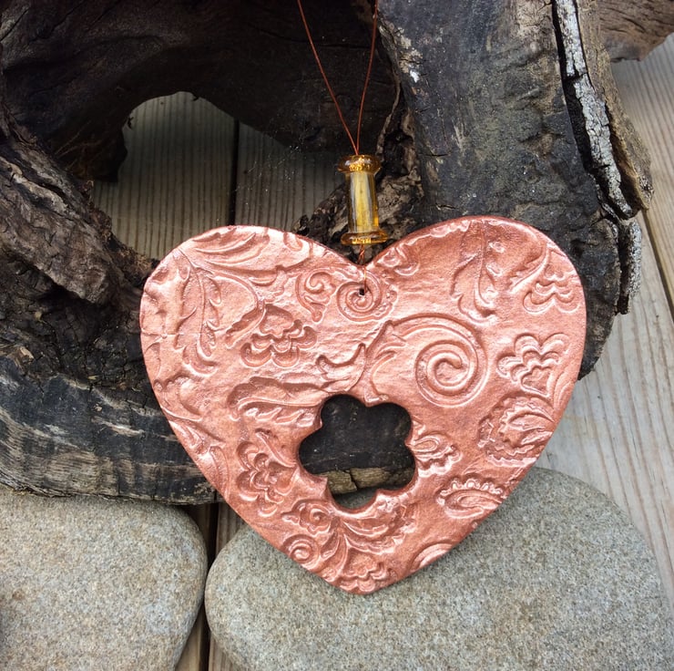 Very pretty little hanging in painted clay, a gorgeous rose gold colour. A great housewarming gift or a golden wedding anniversary gift. Individually handmade, so each one is slightly different, adds to the charm. Nothing mass produced on my table!