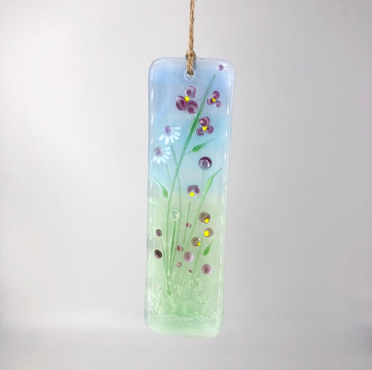 A lovely fused glass light catcher with pretty pink flowers. Hung on a piece of jute it allows the light to travel through - this gives the piece depth and shows off the full beauty of the glass.