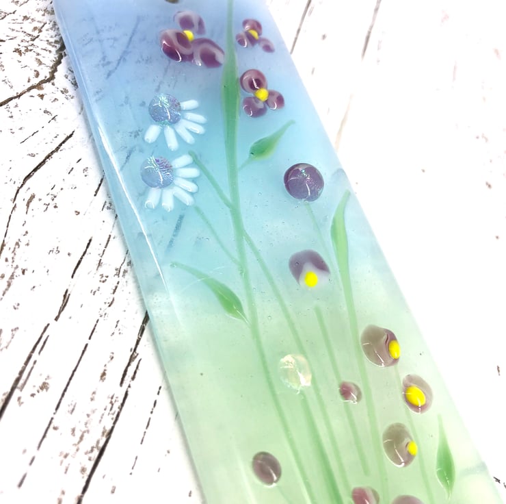 I've always been a stickler for detail which isn't always easy to achieve with fused glass. After many hours of experimenting I created my meadows which are made up of tiny lamp worked flowers and foliage with gorgeous accents of sparkle from dichroic glass. The result is ethereal - delicate, feminine and dreamy.