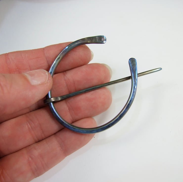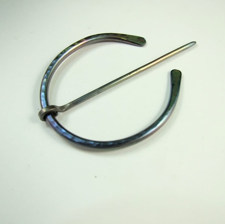 The ring is hand forged from 2.5mm solid Titanium wire with hammered texture and the pin is made from 2mm wire, shaped with a rounded end. Once made the brooch has been heat treated to create the blue tones on the metal.