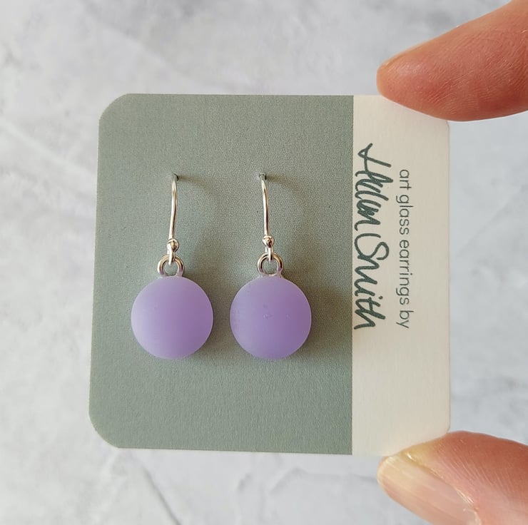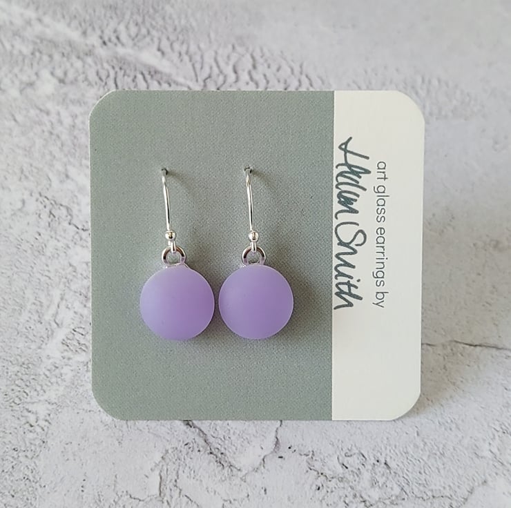 A pair of pretty lilac glass drop earrings with a satin finish reminiscent of sea glass. The 2 layers of glass and the satin finish give these earrings a beautiful subtle glow quite different from the more usual shiny appearance of glass.