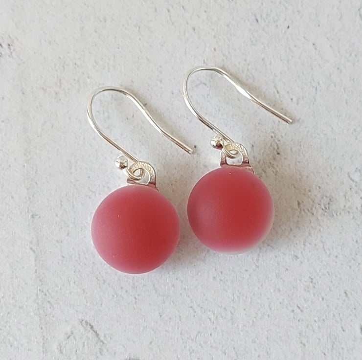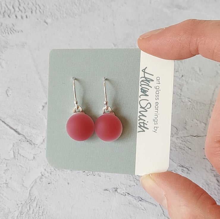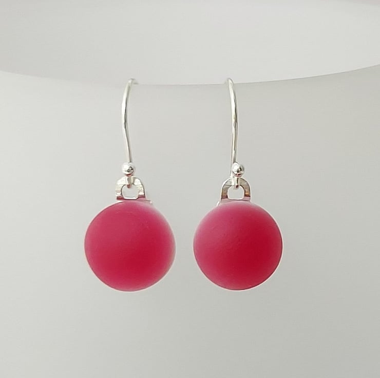A pair of luscious raspberry pink glass drop earrings. The glass drops have a satin finish reminiscent of sea glass giving these earrings a beautiful subtle glow quite different from the more usual shiny appearance of glass.