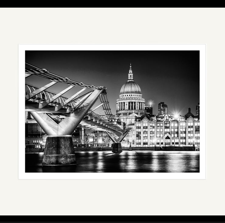 A beautiful limited edition (250) mounted photograph of the Millennium Bridge, St.Paul's cathedral and the River Thames in London, gently illuminated as dusk falls. Reflections of the city lights in the foreground adds interest and atmosphere to this lovely print. It is available in lively colour or sophisticated black and white.