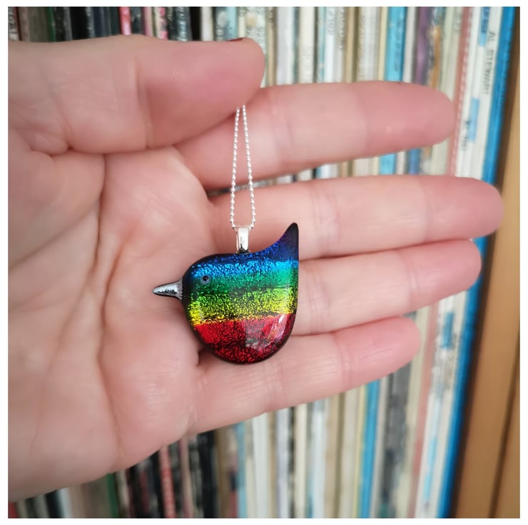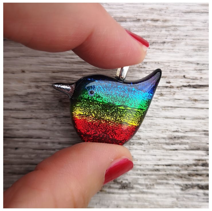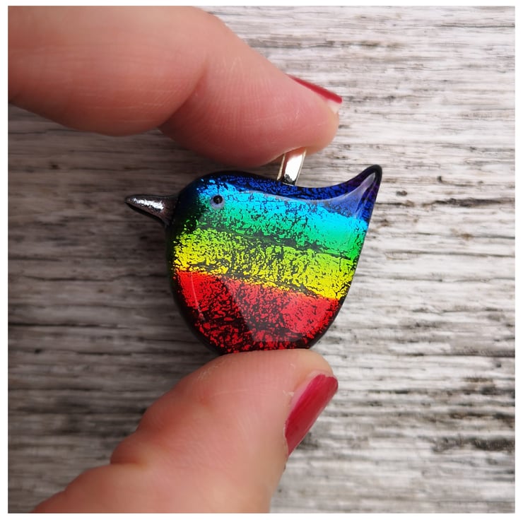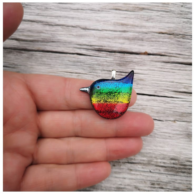This listing is for a colourful little dichroic 'Rainbow Wren of Hope' pendant with a silver beak.