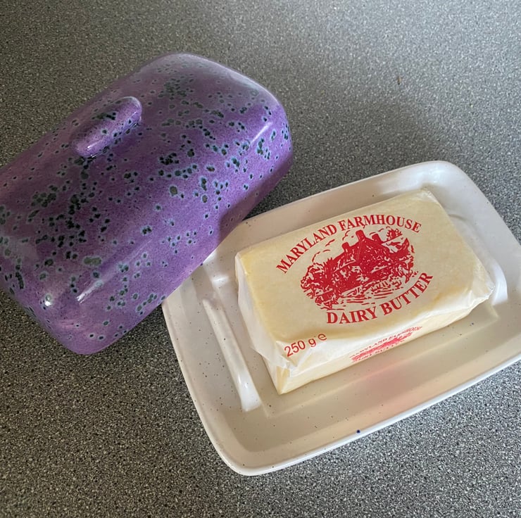 Each butter dish is hand made by the artist and individually hand glazed to ensure high quality. Each butter dish takes approximately two hours to make using high-quality earthenware pottery clay that is fired in my own electric kiln in my ceramic studio. Not mass-produced in some factory in a far off land, these butter dishes are made by hand and each one has its own identity and is made to the exacting high standards of the artist.