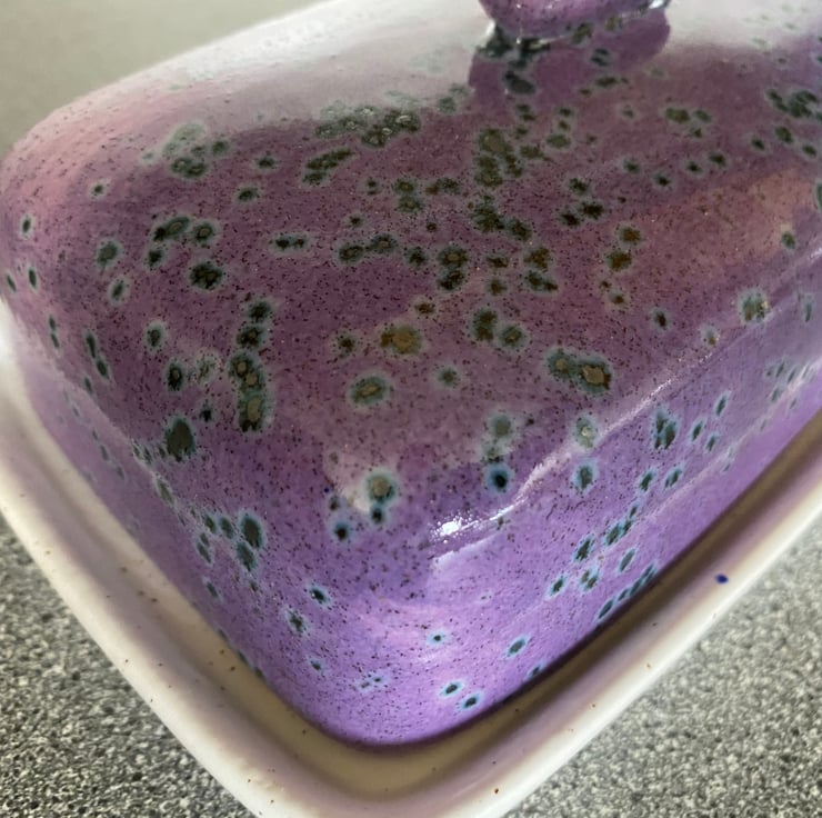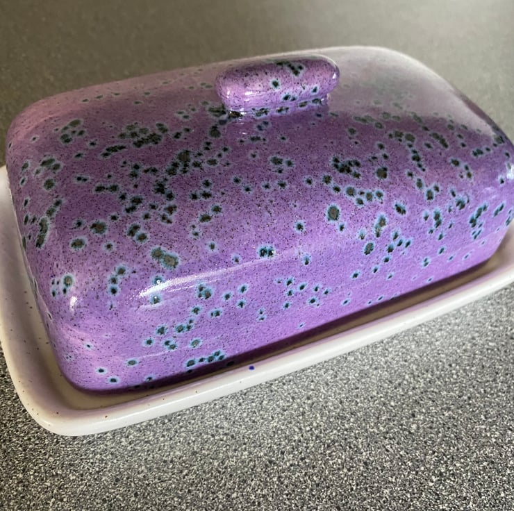 A uniquely designed ceramic butter dish with lid is an earthenware dish, pottery butter dish with a smooth surface lid in purple speckle ceramic glossy glaze. This butter dish is an ideal tableware gift for any couple looking for a covered butter dish or butter keeper.