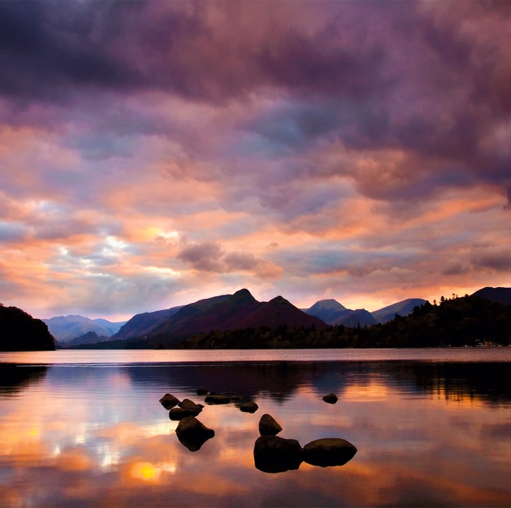 A beautiful sunset over Derwent Water in the Lake District, Cumbria, England.