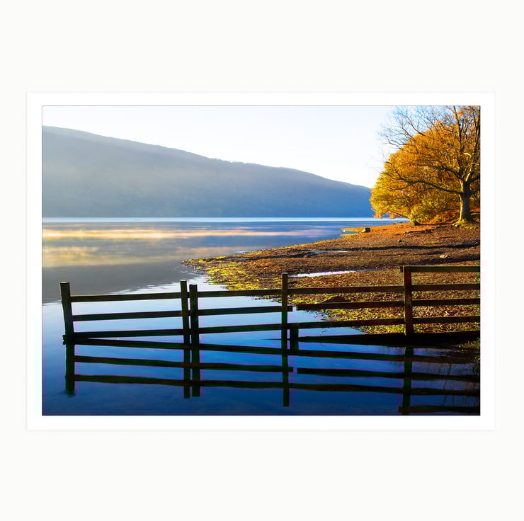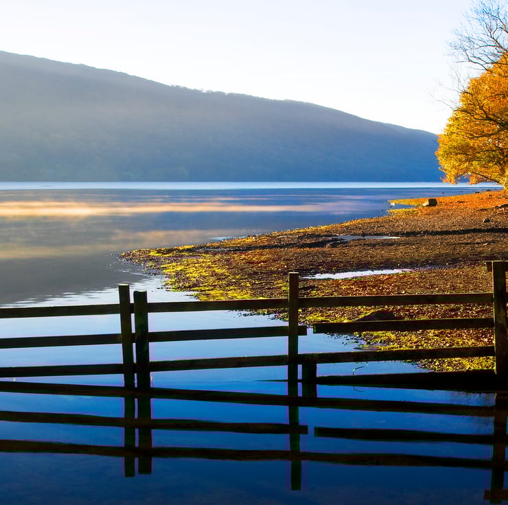 A peaceful sunrise on Coniston Water in the English Lake District. The early morning light filters through a touch of low lying mist above the mirror-like surface of the water and gives a golden glow to the autumn foliage.