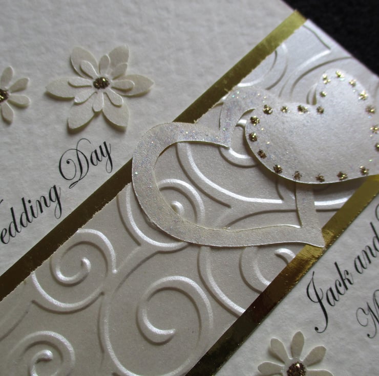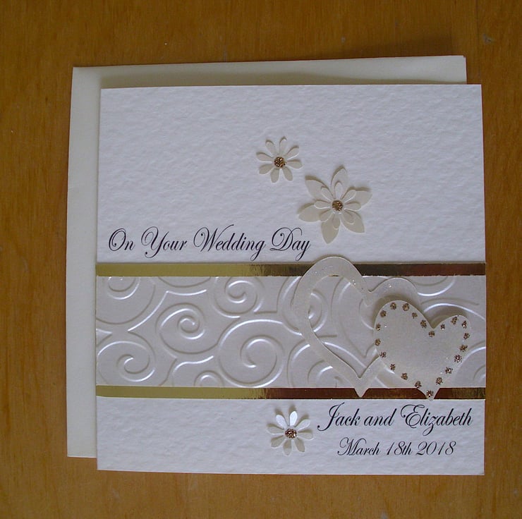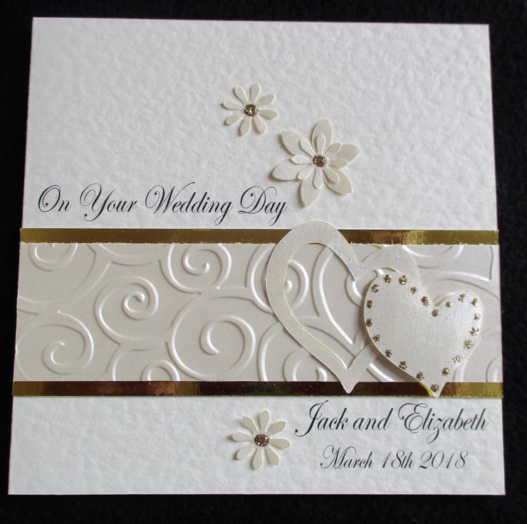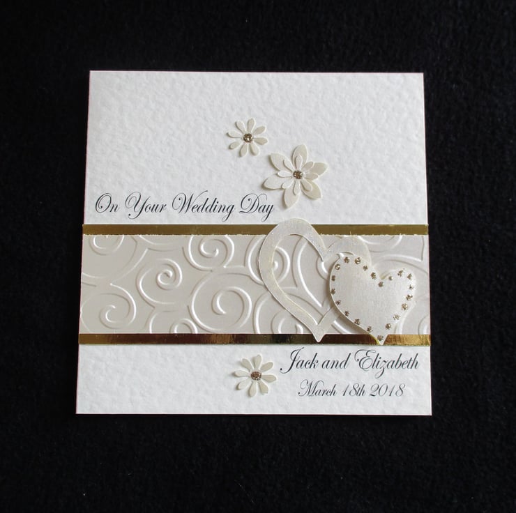 Sparkly Ivory and Gold hearts personalised wedding congratulations card.