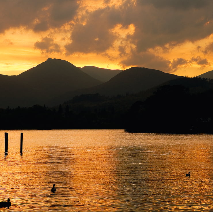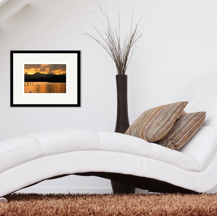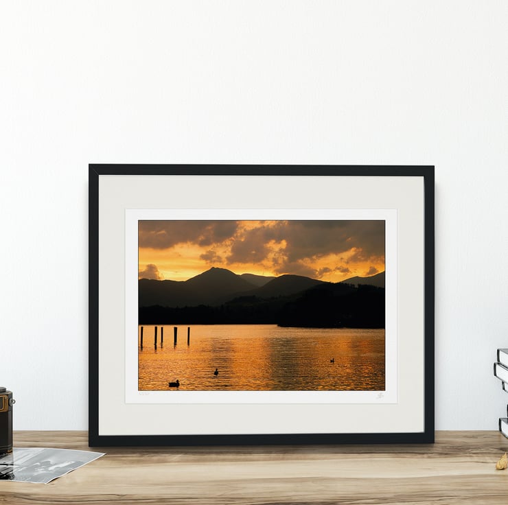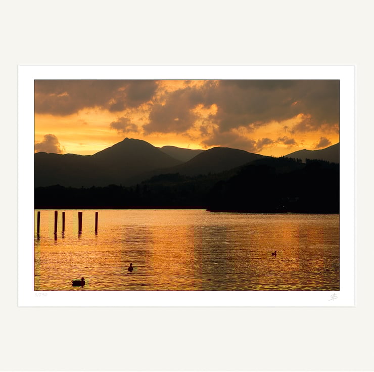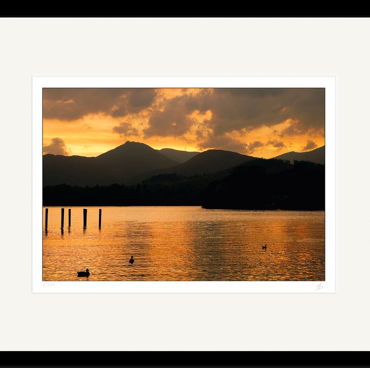 A beautiful limited edition (250) mounted photograph of a stunning golden sunset over Derwent Water in the English Lake District, Cumbria.