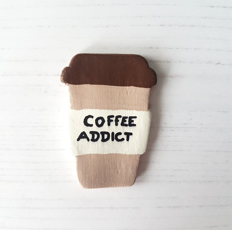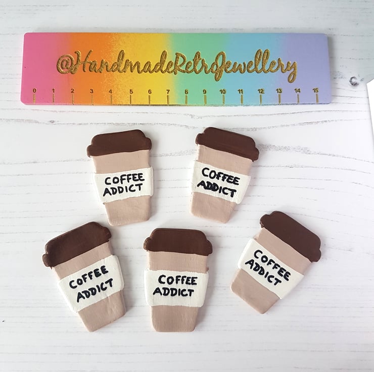 The cup is made from air dry clay, then finished off using a dryer, and finally hand painted using acrylic paint. The piece is then sealed with a matt varnish to protect, and can be finished on the back with either a brooch pin or magnet, to complete your bespoke piece