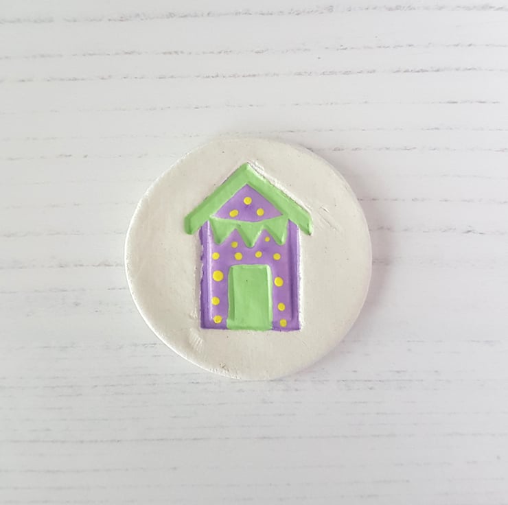 This round beach hut disc is made from air dry clay, hand stamped, then finished off using a dryer, and finally hand painted using acrylic paint. The piece is then sealed with a matt varnish to protect, and can be finished on the back with either a brooch pin or magnet, to complete your bespoke piece.
