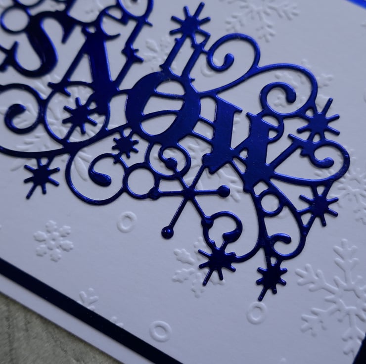 A panel of white card has been embossed with snowflakes before being layered onto blue mirri card. A blue 'Let it Snow' die cut image has been attached to the centre of the card.