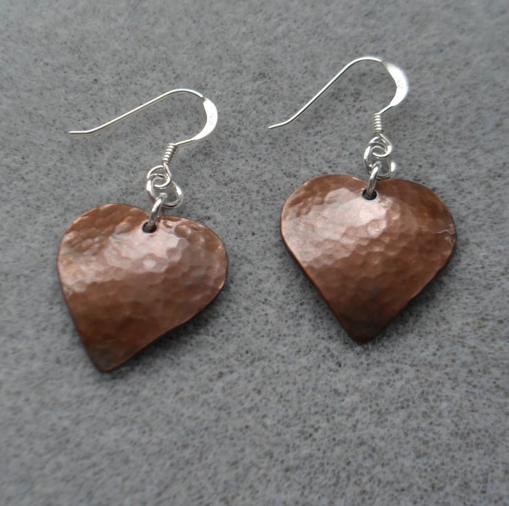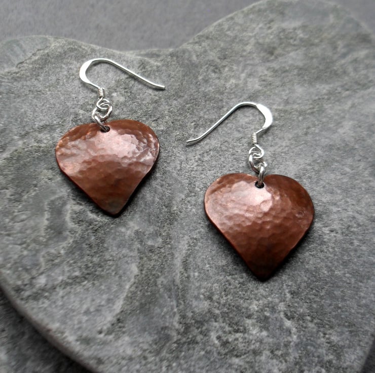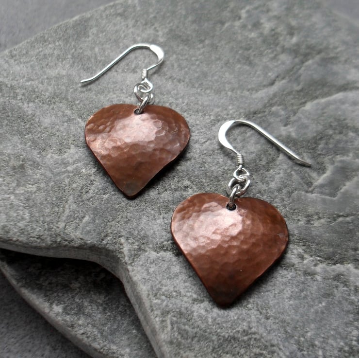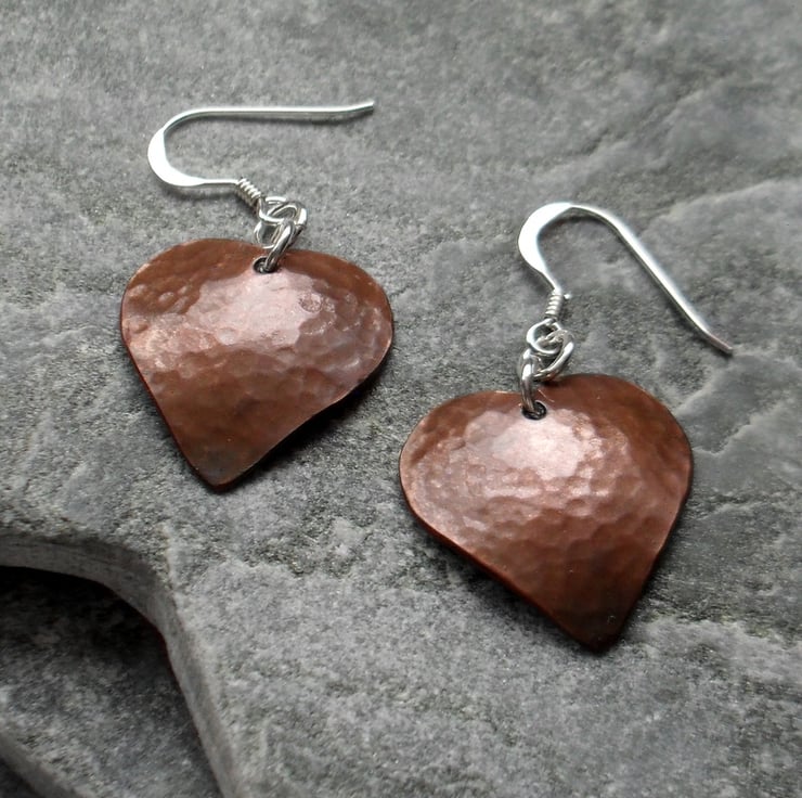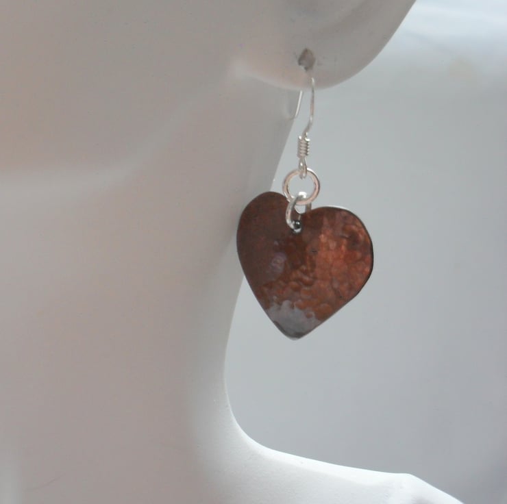 copper Heart earrings which have been textured,domed, tumbled and oxidised are attached to sterling silver ear wires with sterling silver jump rings
