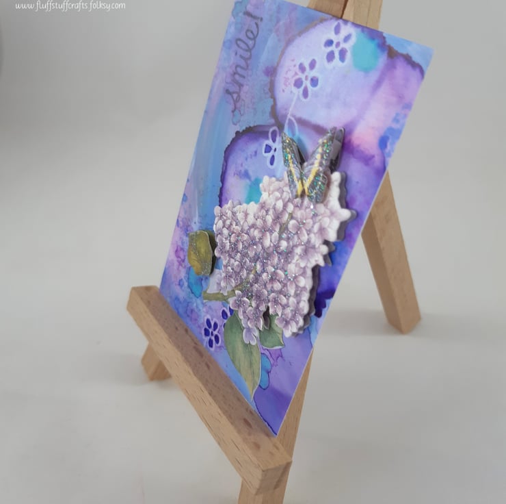 Mixed media ACEO featuring a butterfly on a buddleia bush card topper overlaid onto a background created using alcohol inks on synthetic paper. The background has a chain of daisies stamped and coloured and the sentiment 'smile!'