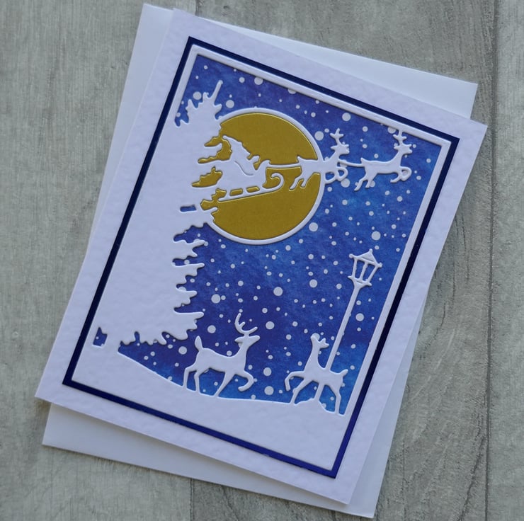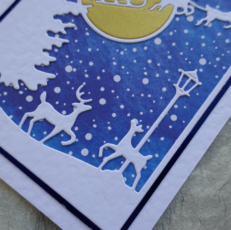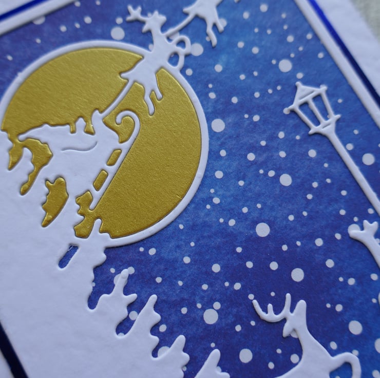 The Christmas Eve scene has reindeer, a lamp post and tree with Father Christmas flying across the sky. The scene has been die cut from white hammer card and attached to a piece of blue snowflake paper. The gold pearlescent moon has been inlaid into the scene.