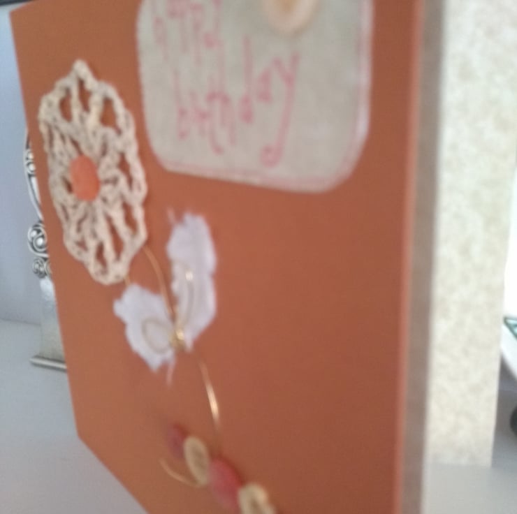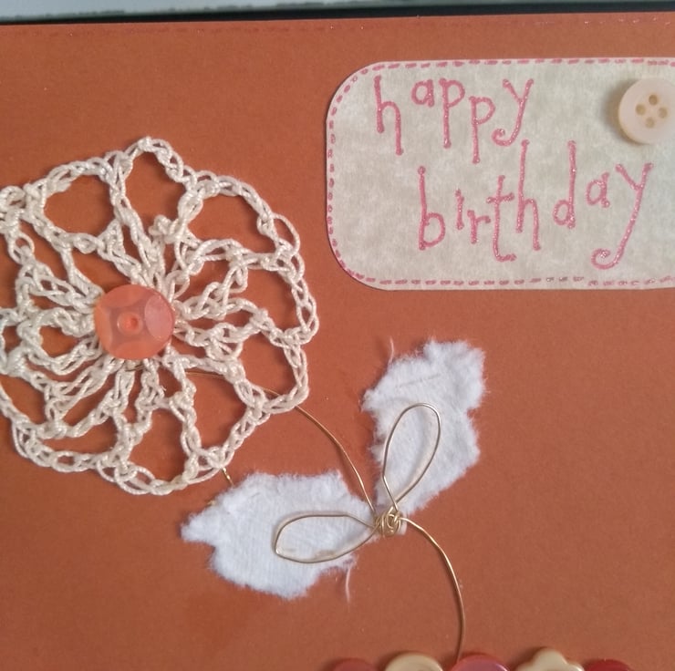 A completely handmade and uniquely designed card. Consisting of burnt orange quality card. A crochet flower with gold metal stem and flowers and off white mulberry paper leaves mounted onto it.