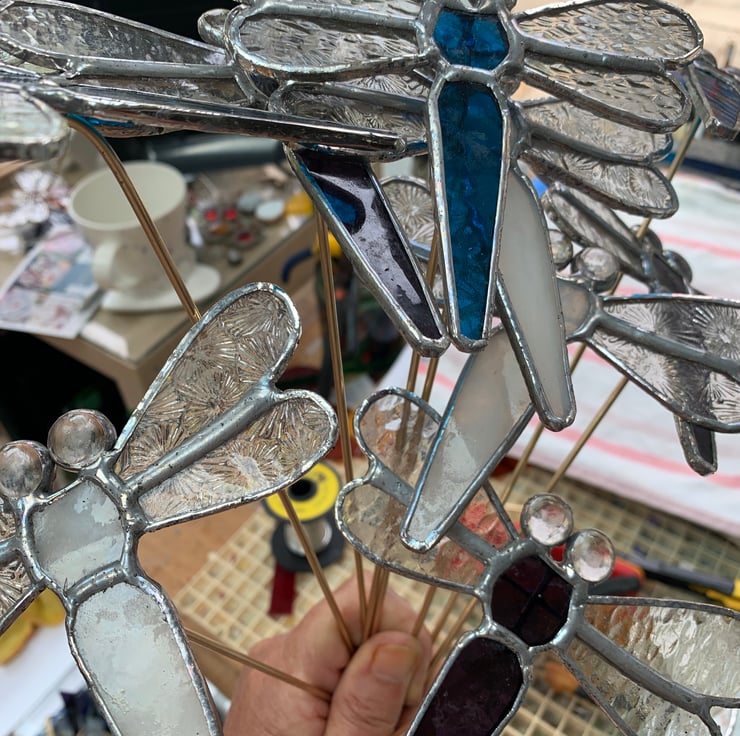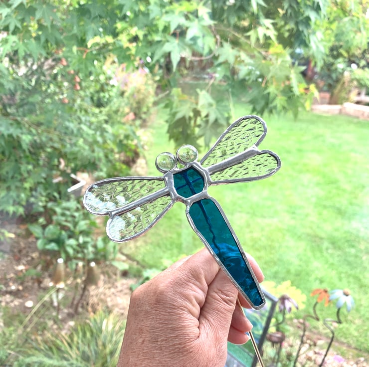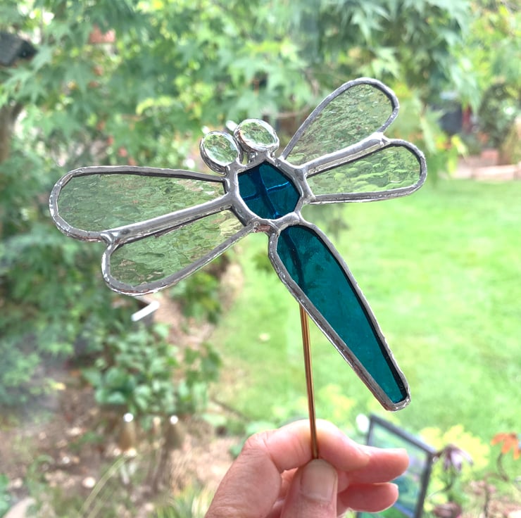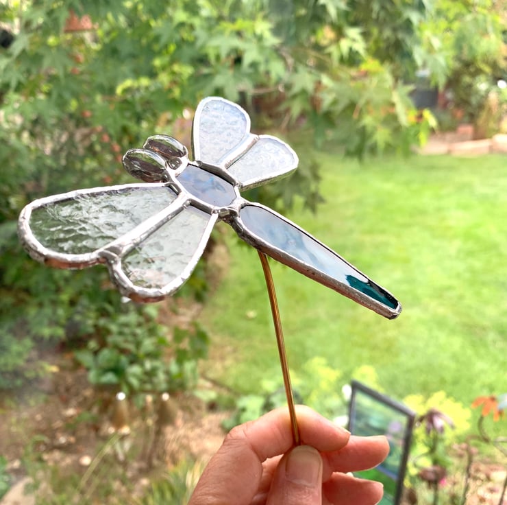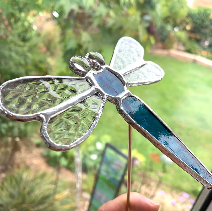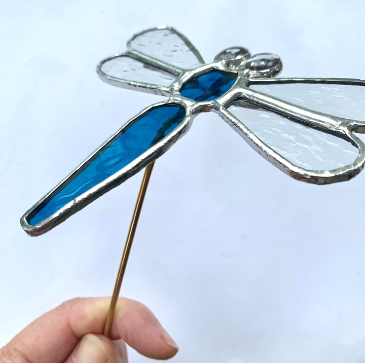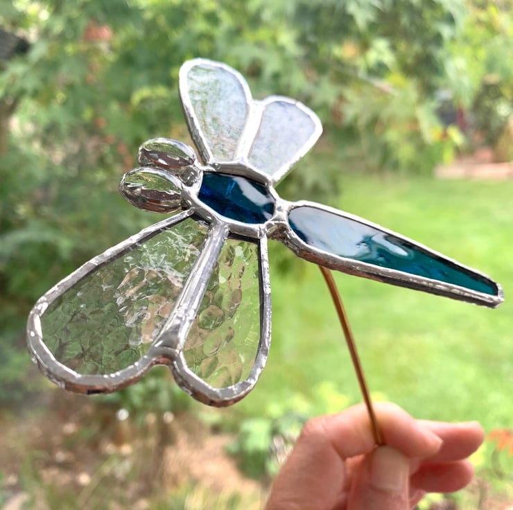 The glass used for this dragonfly is petrol blue English muffle glass and clear textured clear glass for the wings.