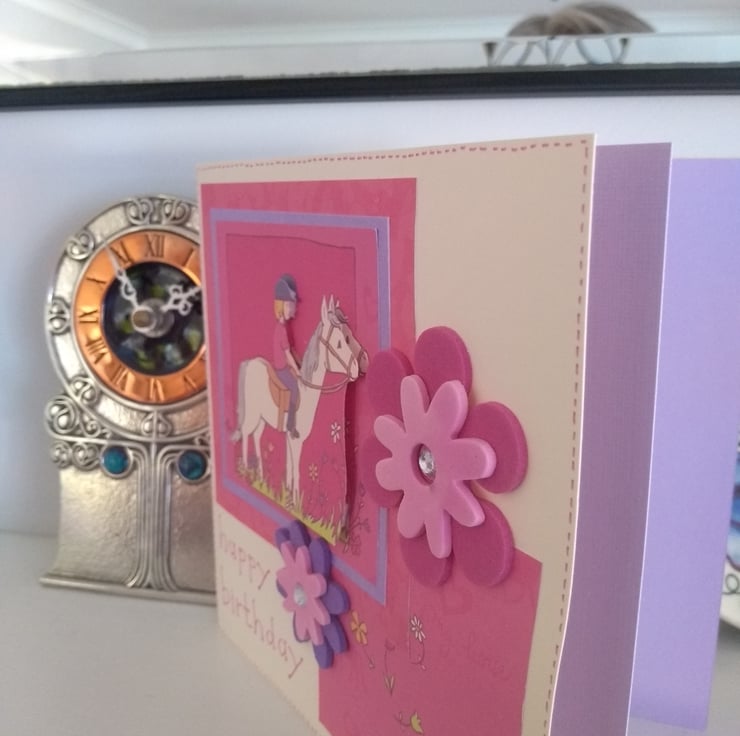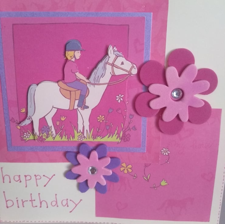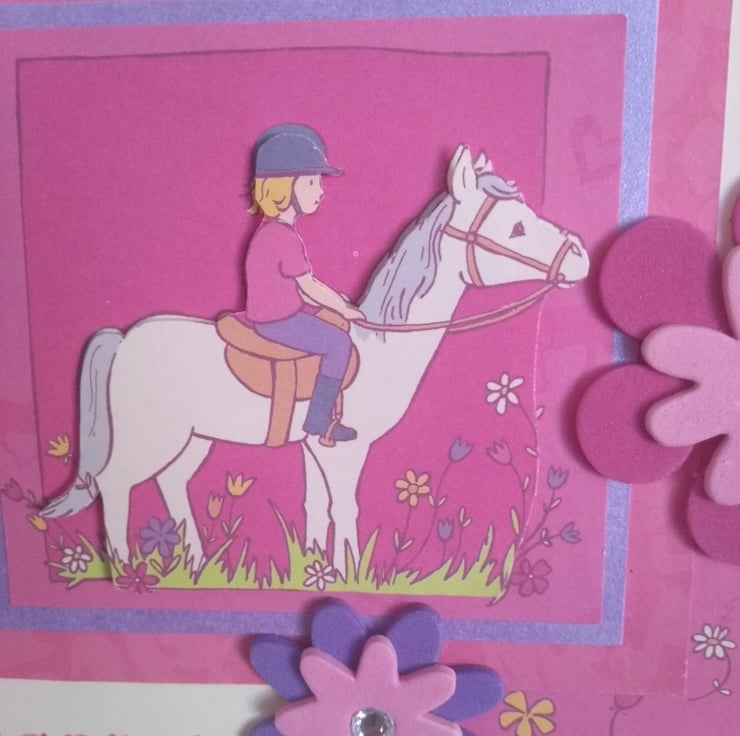 A completely handmade and uniquely designed card. Consisting of a girl on a pony decoupage mounted onto quality cream card. Happy birthday hand written in pink ink. Finished off with funky foam flowers and rhinestones