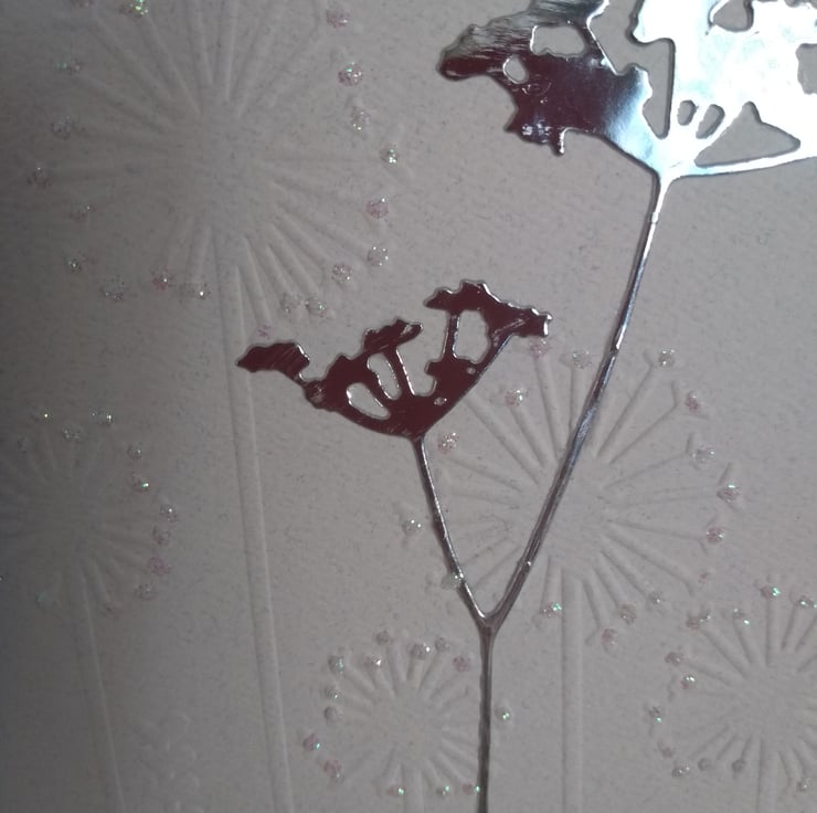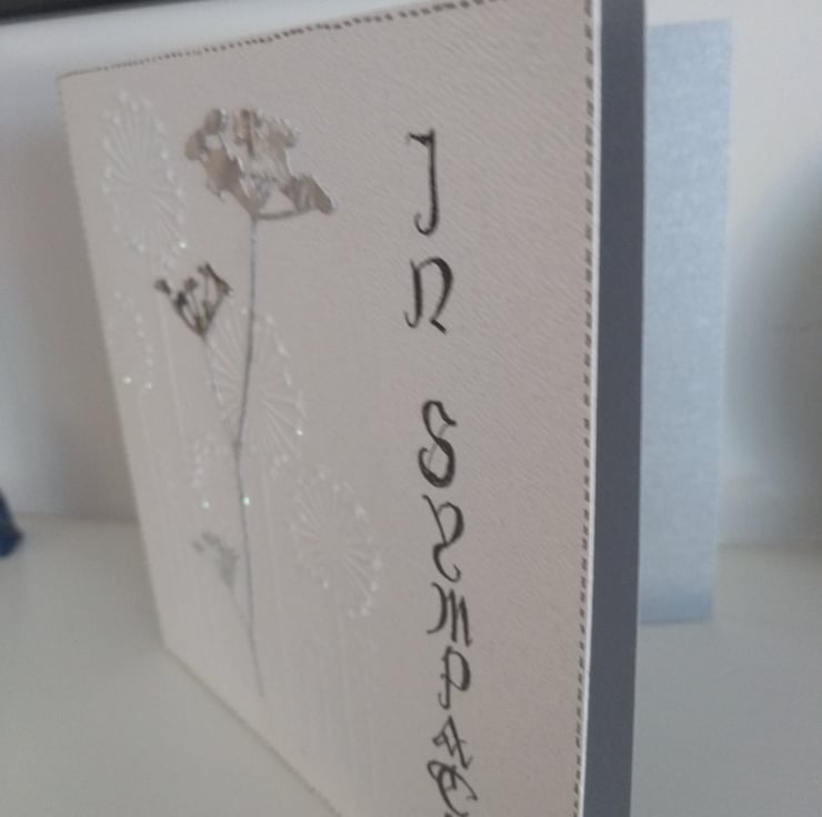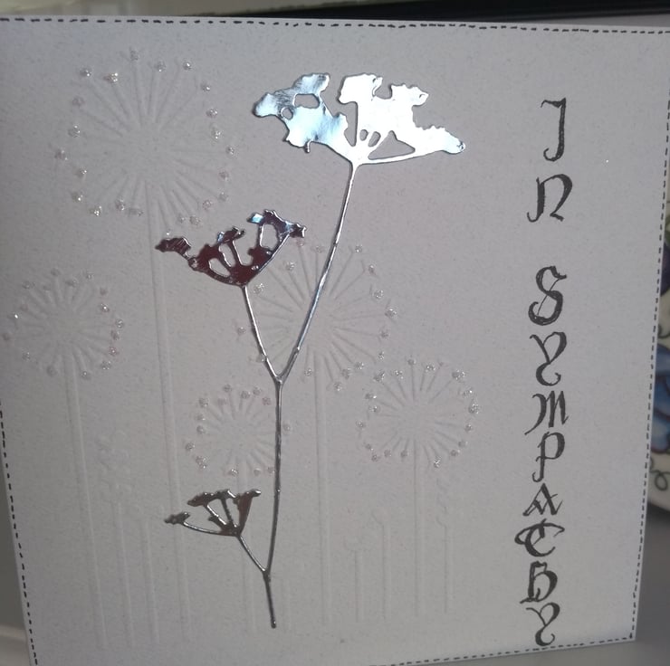 A completely handmade and uniquely designed card. Consisting of pristine white quality card which has been embossed with dandelions and highlit in subtle silver. In sympathy hand written in black ink. Finished off with an allium die cut from silver mirri card.