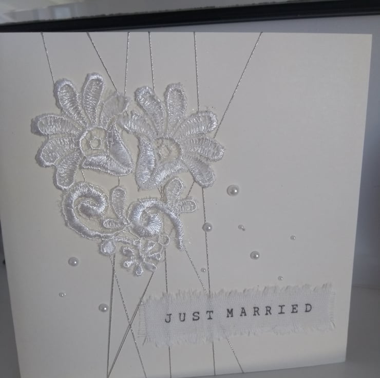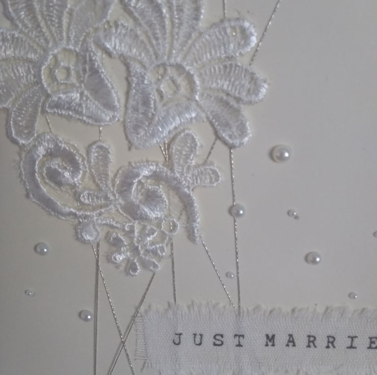 A completely handmade and uniquely designed card. Consisting of quality cream card which has been topped with a beautiful piece of guipure lace. Wrapped with silver thread. Just married printed on to l Ben fabric. Finished off with various sizes of pearl drops