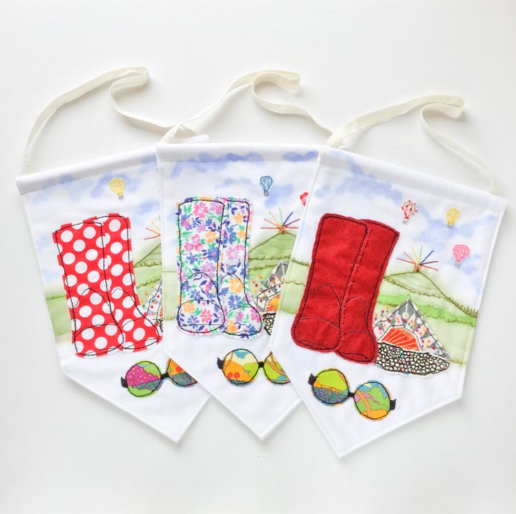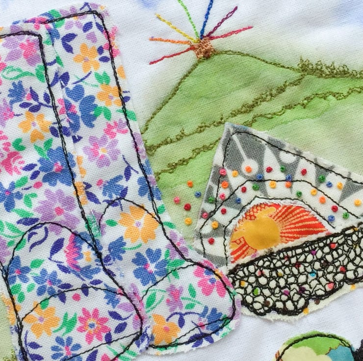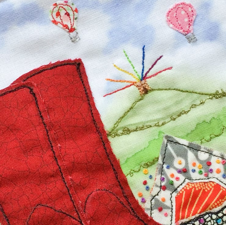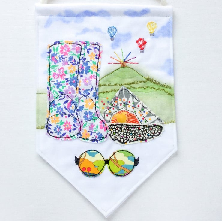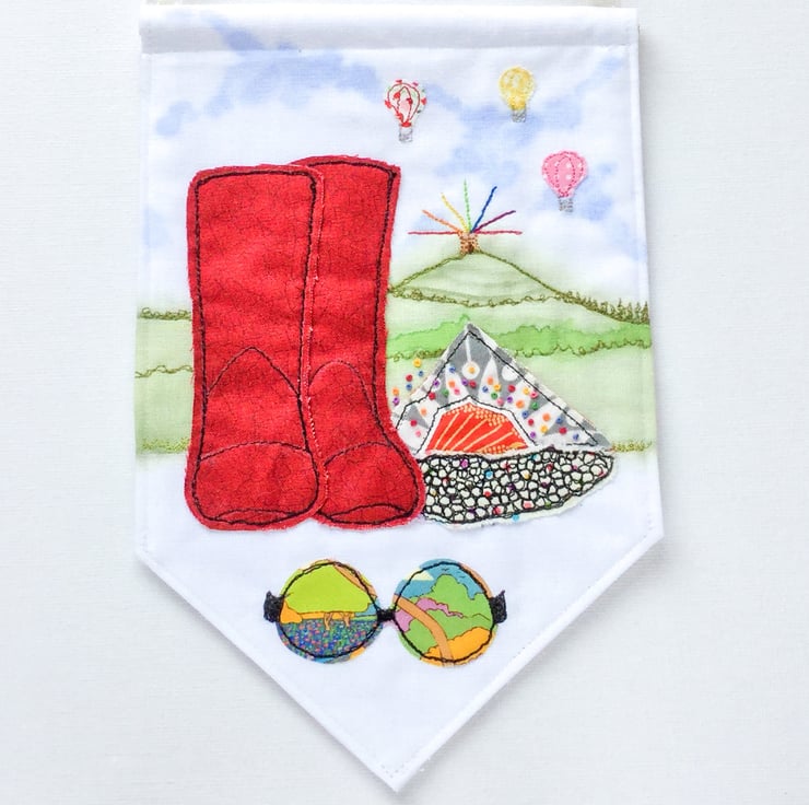 This design has been made using a mixture of appliqué, freemotion and hand embroidery paying homage to the sound stage at Glastonbury, wellies, hot air balloons and shades all the vibes without the mud!