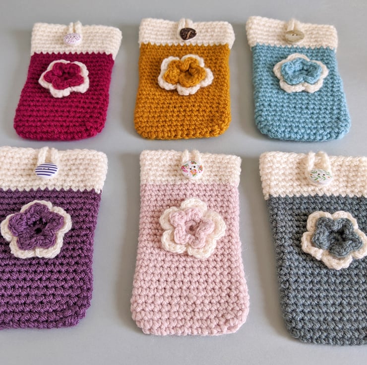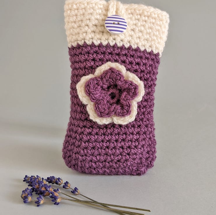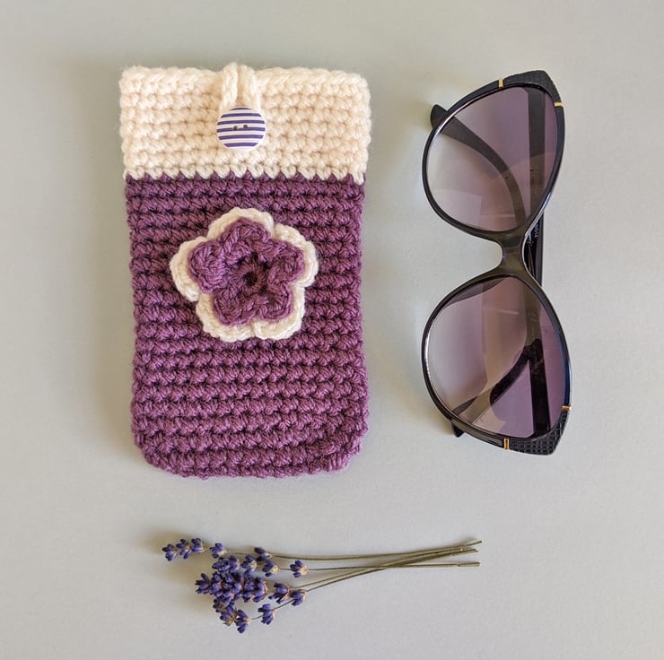 Crocheted from a soft wool and acrylic blend yarn, the two colours compliment each other beautifully in a dip-dye effect that has a light summery feel to it. A small crocheted flower in the same colourway as the case is sewn to the front.