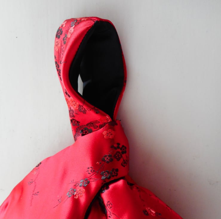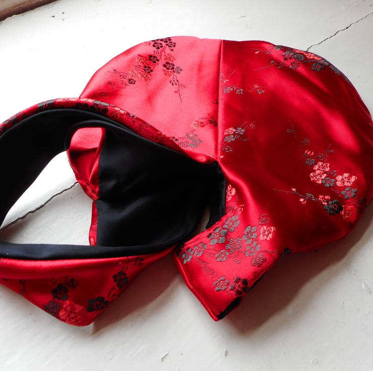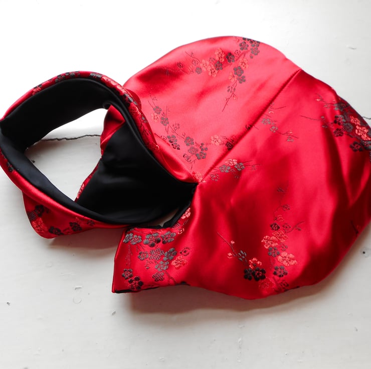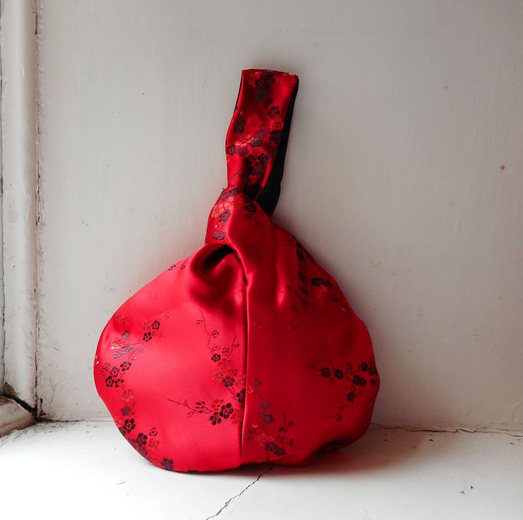 The outer fabric is a gorgeous red satin with a cherry blossom woven pattern in black and red. The satin has a beautiful sheen that is picked up by the red blossoms, which shimmer prettily. This is a perfect evening bag.
