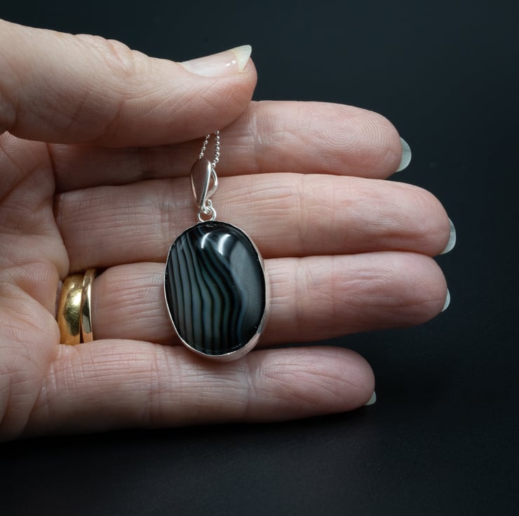 A lovely back striped agate cabochon is set in a sterling silver pendant mount with a solid silver back and hangs from a sterling silver ball chain .