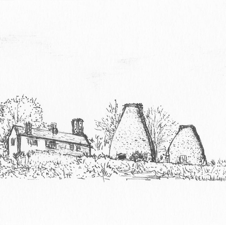 Up on the hill at the edge of Corbridge lies the old Walker's Pottery and its distinctive, historic and unusual-for-the-area bottle or 'updraft' kilns. These are listed, and beautiful to look at, providing quite a landmark, as I see them every day. Here is my original pen drawing of one of the views, along with its adjacent house and outbuildings.