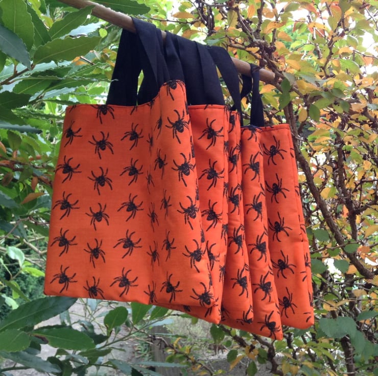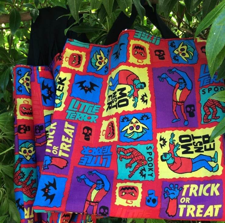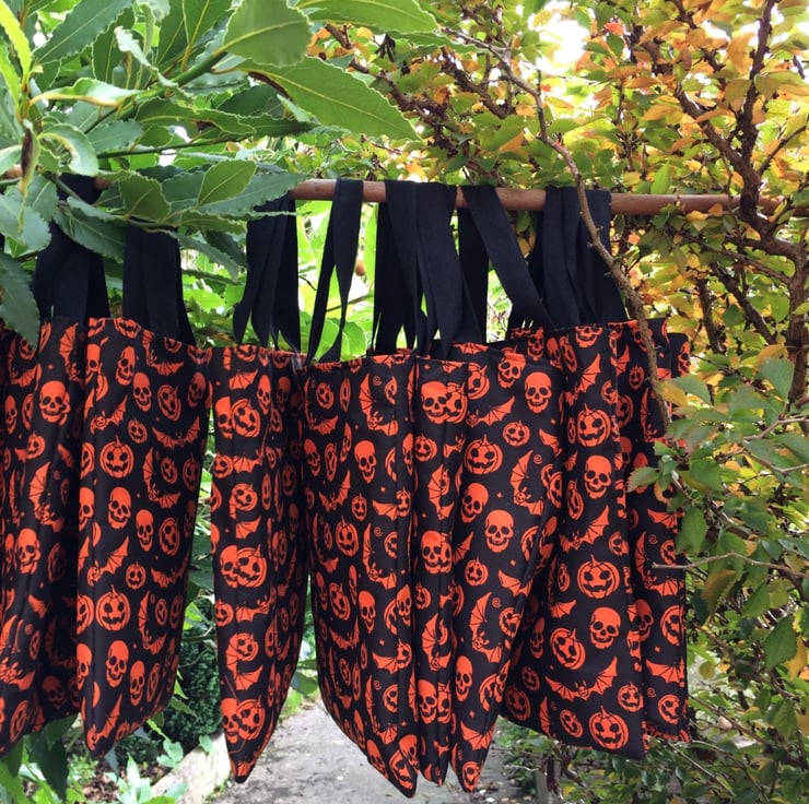 An assortment of trick and treat bags in various prints all made in cotton fully lined, can be used year after year