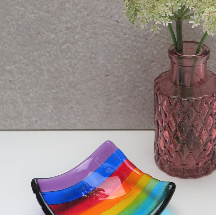 It has been handmade from individual strips of coloured transparent glass which have been fused in my kiln and slumped to make a small square dish.
