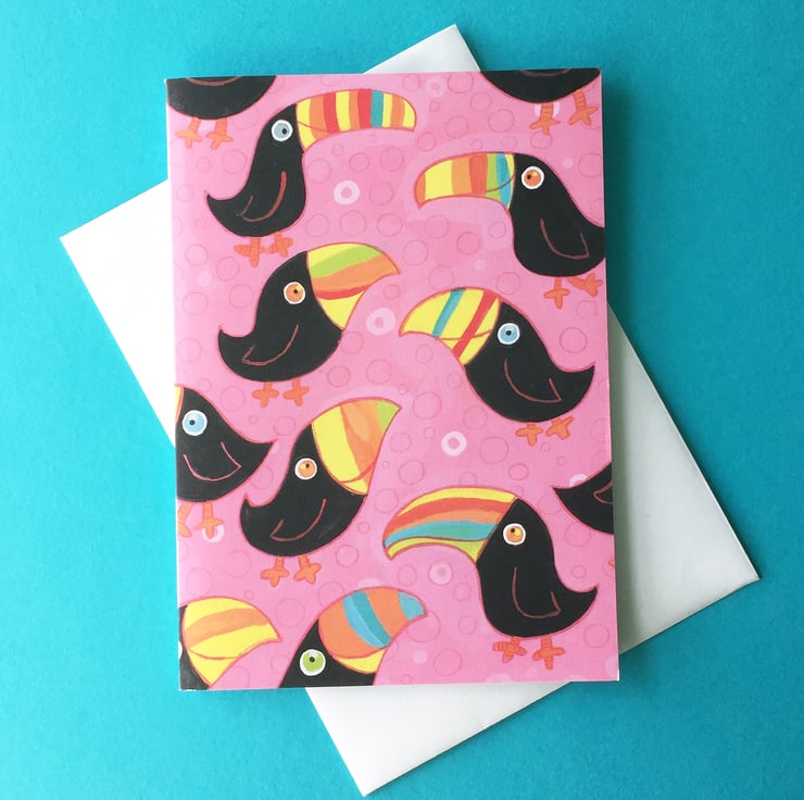 For this toucan (ish!) design (from an original mixed media painting) I used one of my favourite colours, brilliant pink- I like painting with bright colours, especially in gouache (like thick watercolour) which gives lovely opaque coverage - and here I also used Caran D'ache Luminance pencils which are especially vibrant.