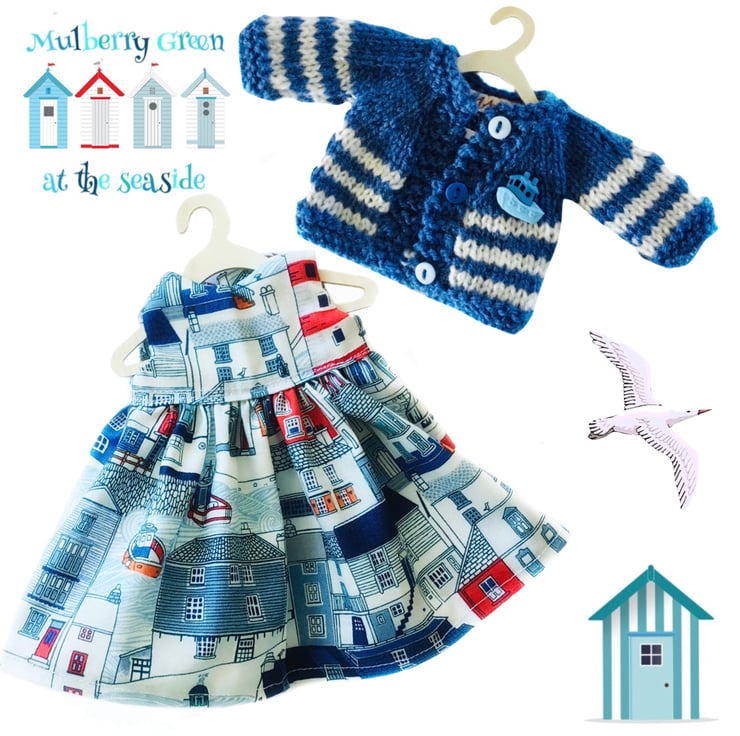 A sweet little seaside cardigan to fit the Mulberry Green characters, in a lovely azure blue with white stripes. The cardigan is hand knitted and is decorated with tiny Pale and darker blue buttons and a little tug boat. It comes on a cute little wooden hanger. It matches the Little Harbour Town dress.