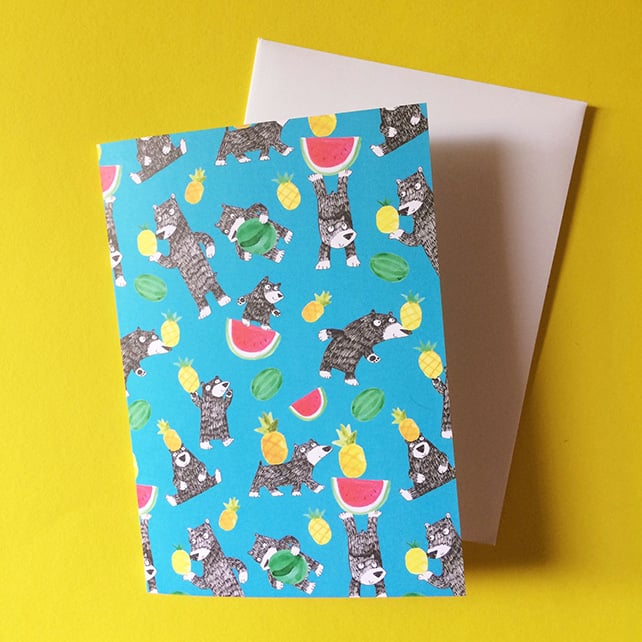 Fun design of bears and fruit on blue background, based on a textile repeat pattern of mine.see my other listings for different colours