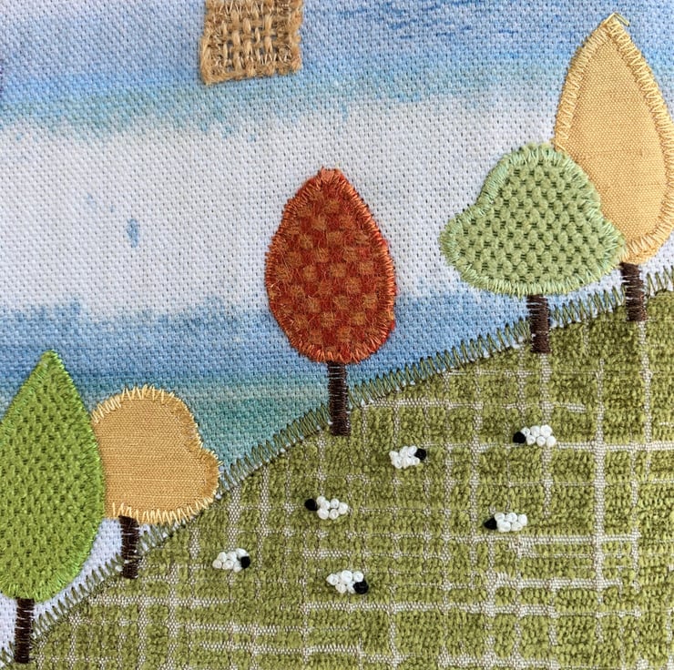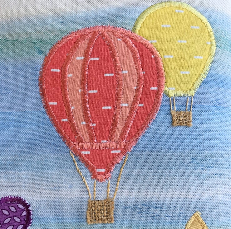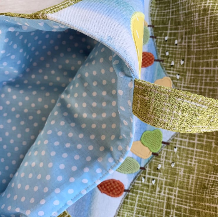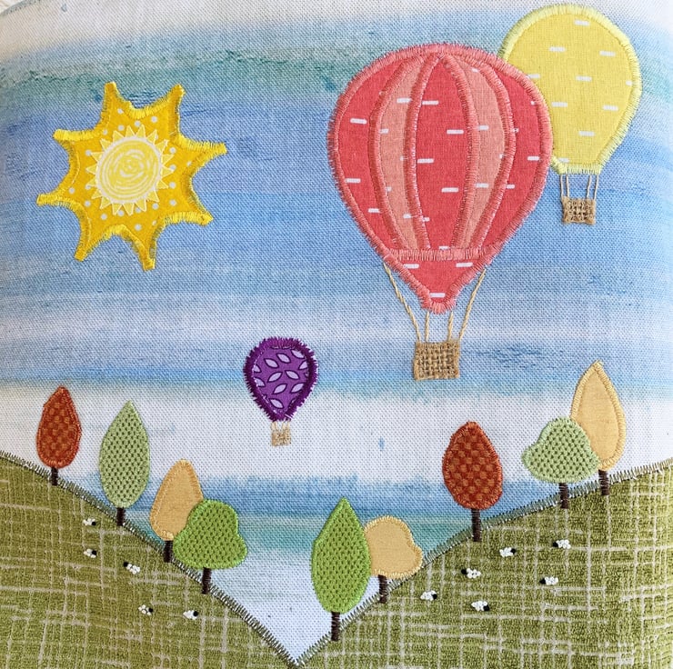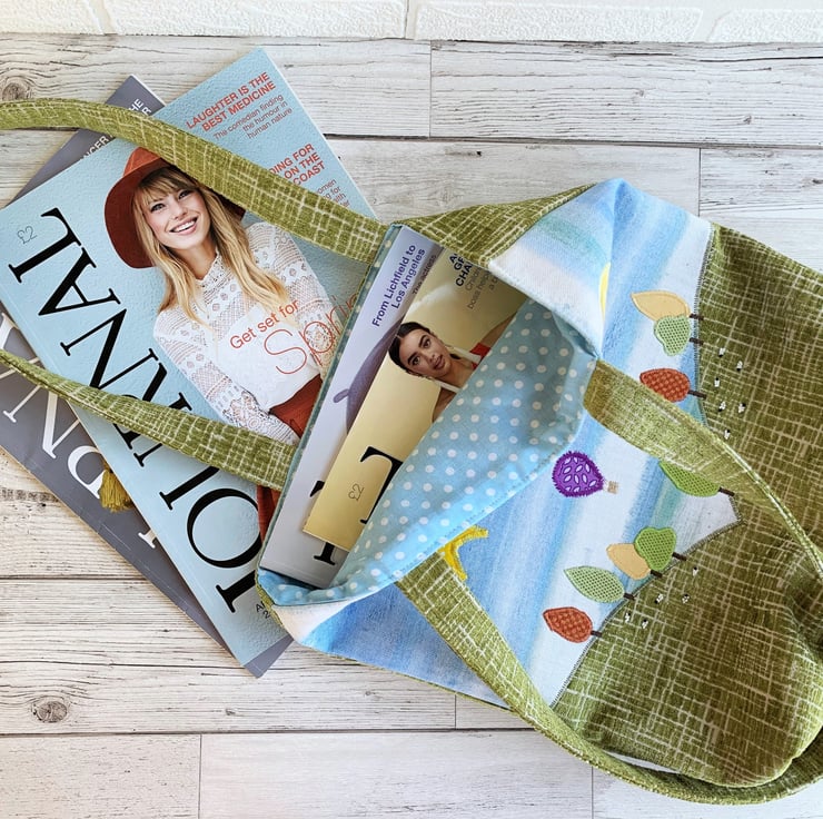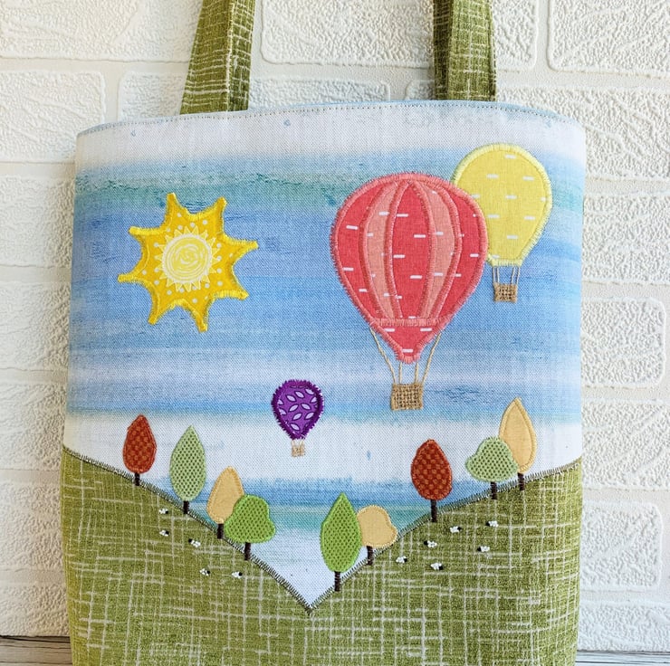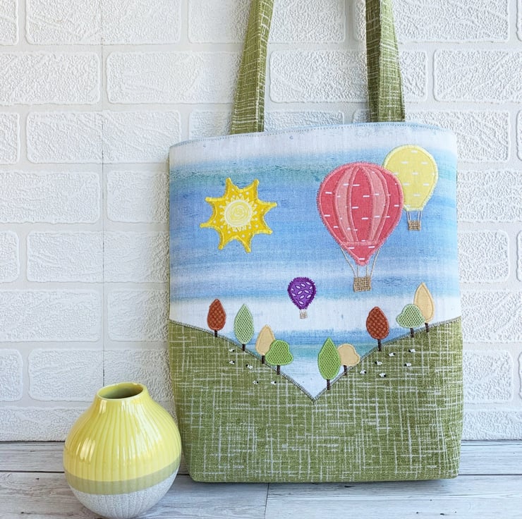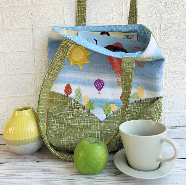 Tote bag with hot air balloons flying over hills. A fun tote bag in textured and velvety green fabric with added pastel blue and white fabric on the front to represent the sky. The bag has an appliqué design depicting hot air balloons flying over hills. Three hot air balloons in salmon/coral pink, yellow and purple float in a sunny tranquil sky over tree-lined hills grazed by sheep. I've used an array of print fabrics for the balloons and sun. The tiny trees are made from golden yellow satin, burnt orange tweed and green textured fabrics. I’ve used hessian to make realistic-looking baskets on the balloons and I've hand-stitched the ropes. There is also hand-stitched detailing on the sun. I've hand-embroidered the tiny sheep using French knots. The bag is lined with pale blue fabric with small white polka dots.