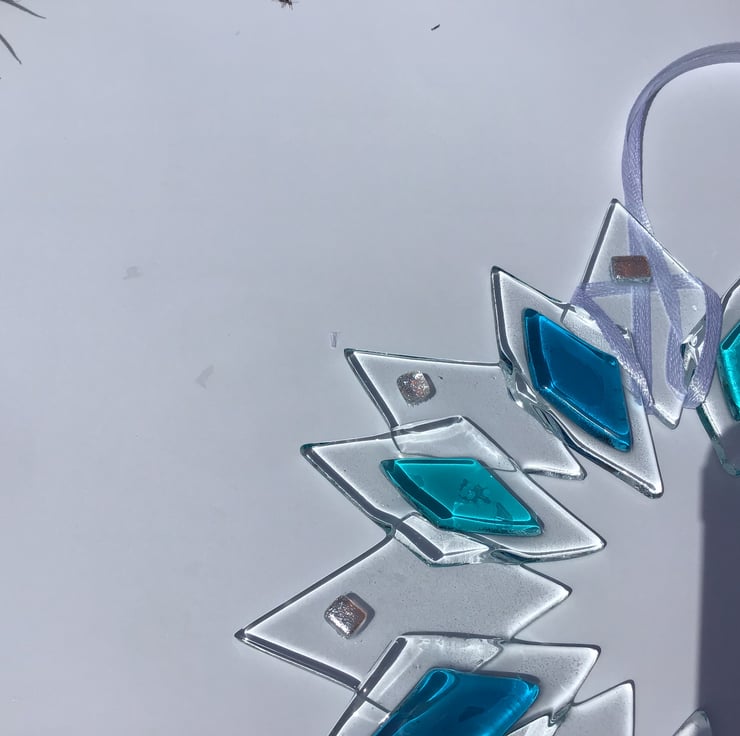Fused glass wreath Christmas decoration . Clear blue and dichroic fused glass ice wreath in fused glass hand made by me .approximately 6.5 inches of loveliness . They can be hung from mirrors or direct on your wall . A beautiful addition for your home for Christmas or all year around .