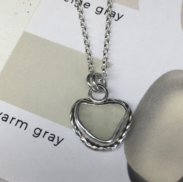 Stunning heart shaped warm grey sea glass and silver pendant with rope edging on an 18’’ 1.4mm sterling silver diamond cut belcher chain