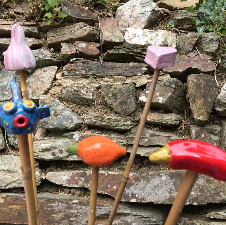 Cane Tops for your garden. Made from red earthenware clay, all glazed to suit the subject! Last for years and years in all weathers in your garden. These individuals Introducing Mr Blue Fish, Red Chilli, Round Carrot, Garlic, Pink Heart . I use a variety of different bamboo canes to give a variety of hole sizes to fit bamboo canes