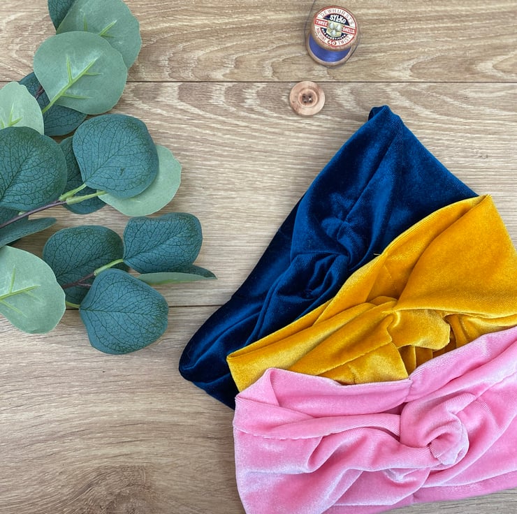 Handmade from velour Jersey a Classic Blue Colour with a Knot at the front.