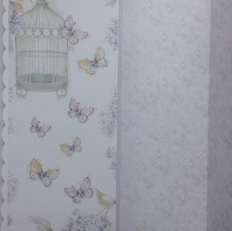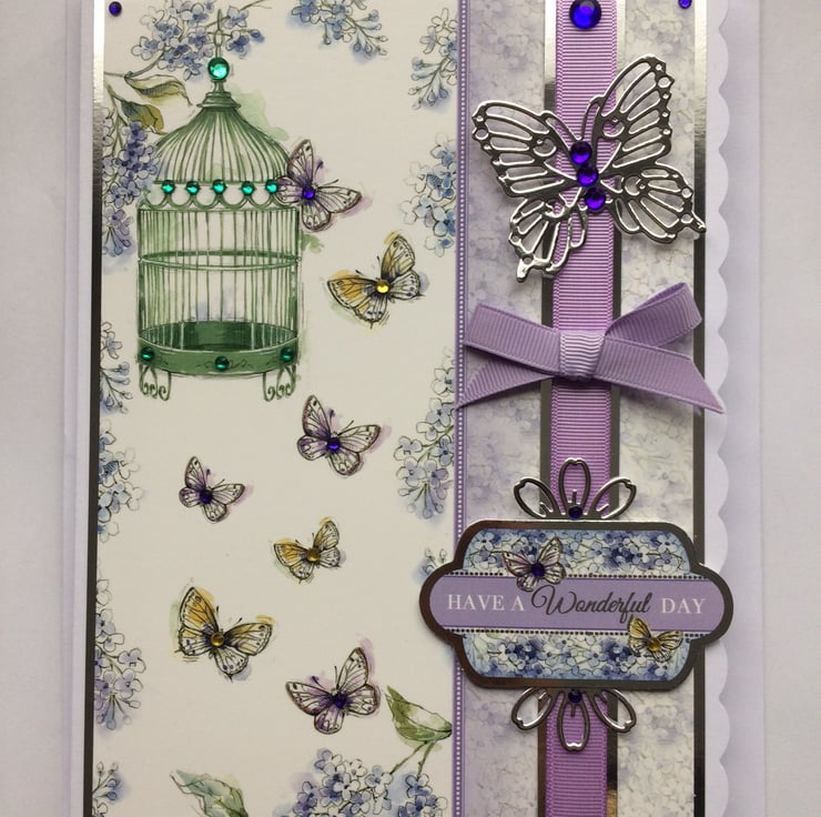 This is a stunning luxury 3D handmade greeting card to send to that special person in your life. The design is a traditional vintage green birdcage hanging in a tree surrounded by flowers and butterflies. The 3D greeting is silver foiled and says "Have a Wonderful Day". The 3D butterfly has also been hand-cut and silver foiled by me.