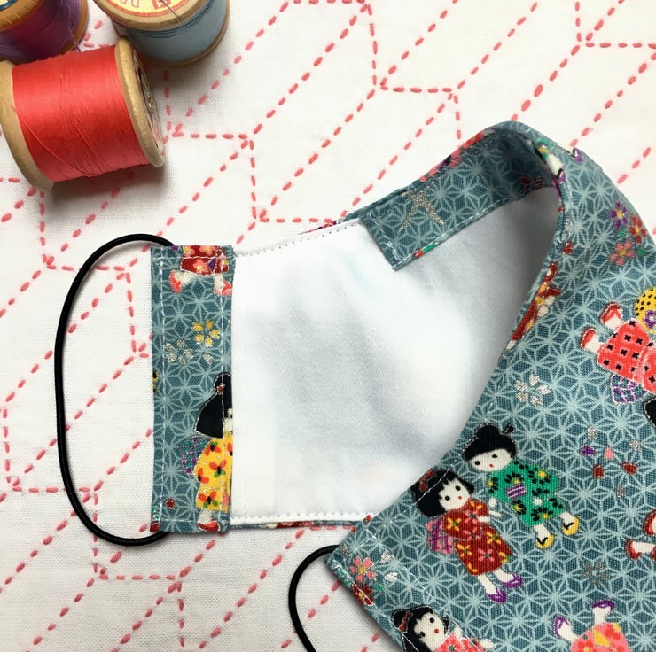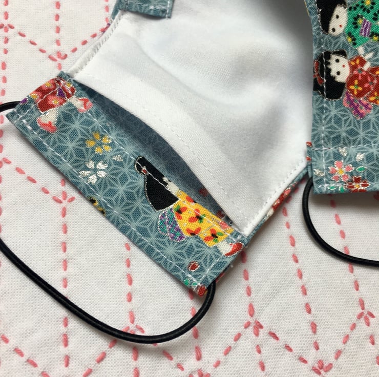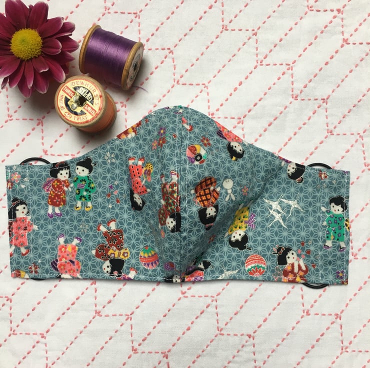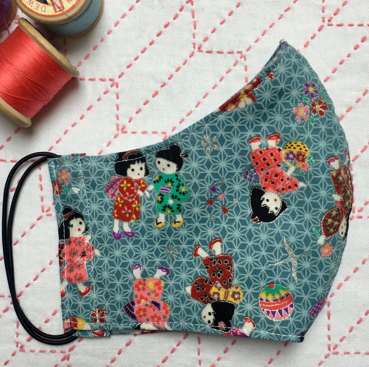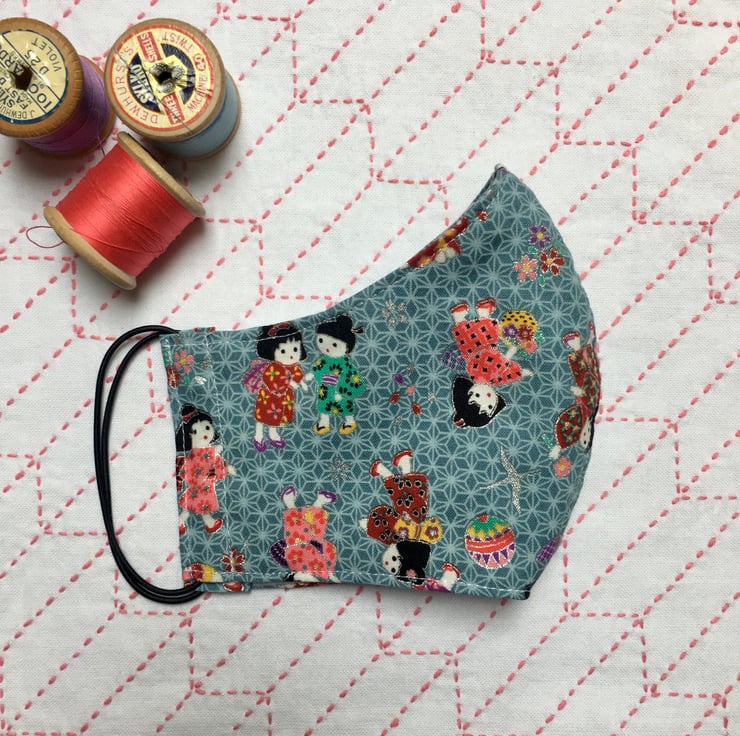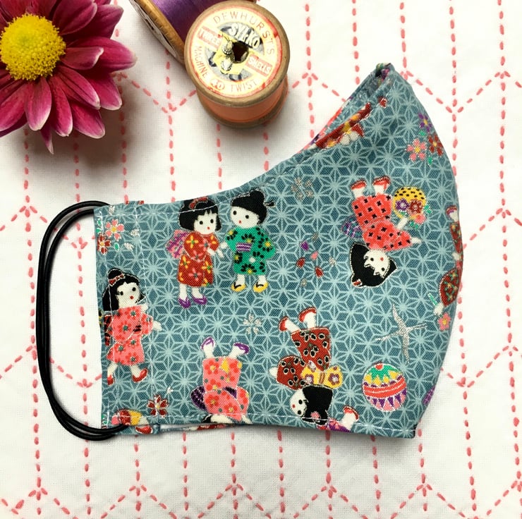 A fashionable Japanese fabric in light blue with children playing has been used to create this face mask. It is gilded with silver. The fabric is 100% high quality cotton and lined with a 600 thread count cotton, which is very soft against the skin. The mask is washable & reusable.